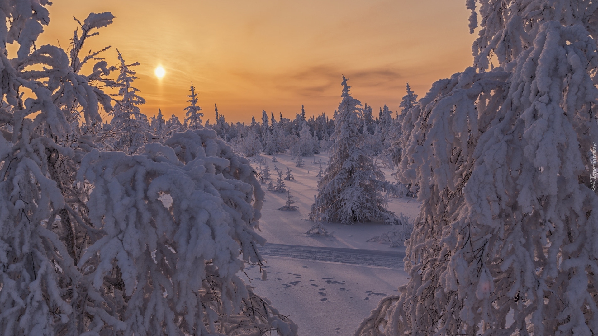 Edytor tapety: Zamglone słońce nad zaśnieżonymi drzewami
