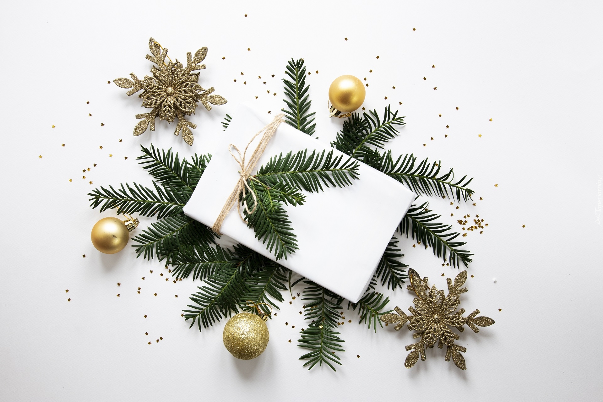 Edytor tapety: Prezent przewiązany sznurkiem na gałązkach świerku