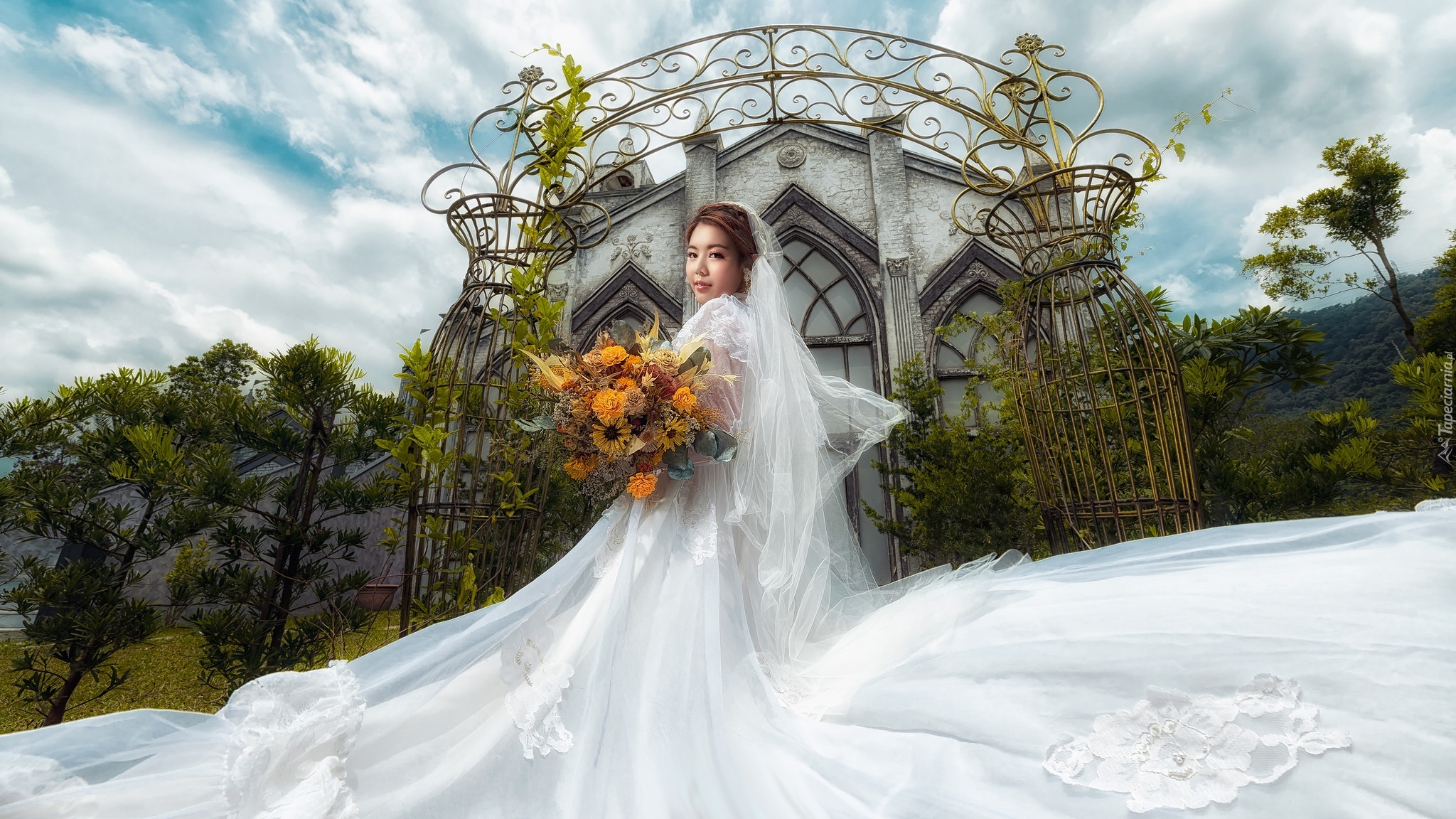Edytor tapety: Panna młoda z bukietem pomarańczowych kwiatów