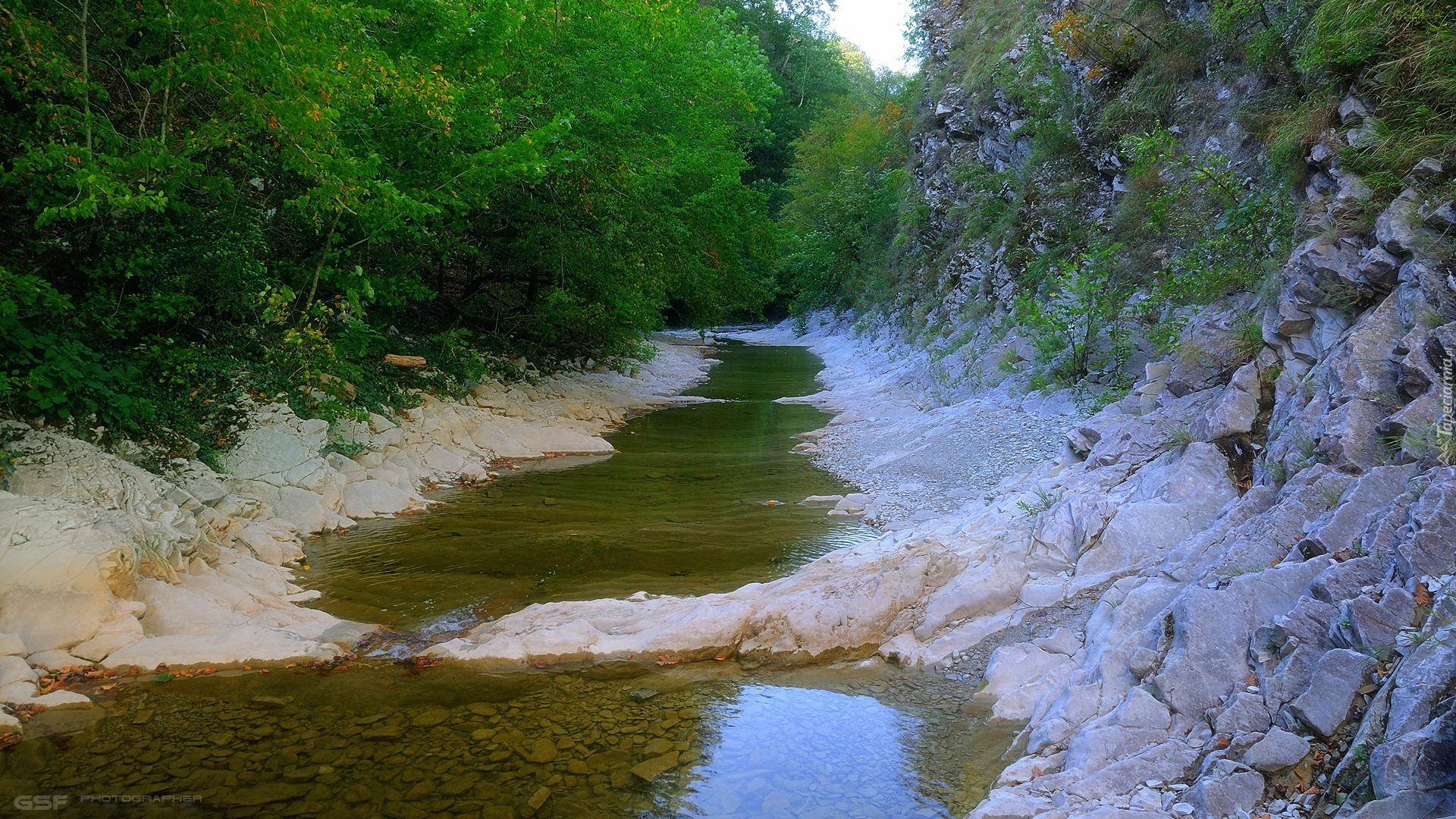 Edytor tapety: Zielone drzewa nad skalistym korytem rzeki