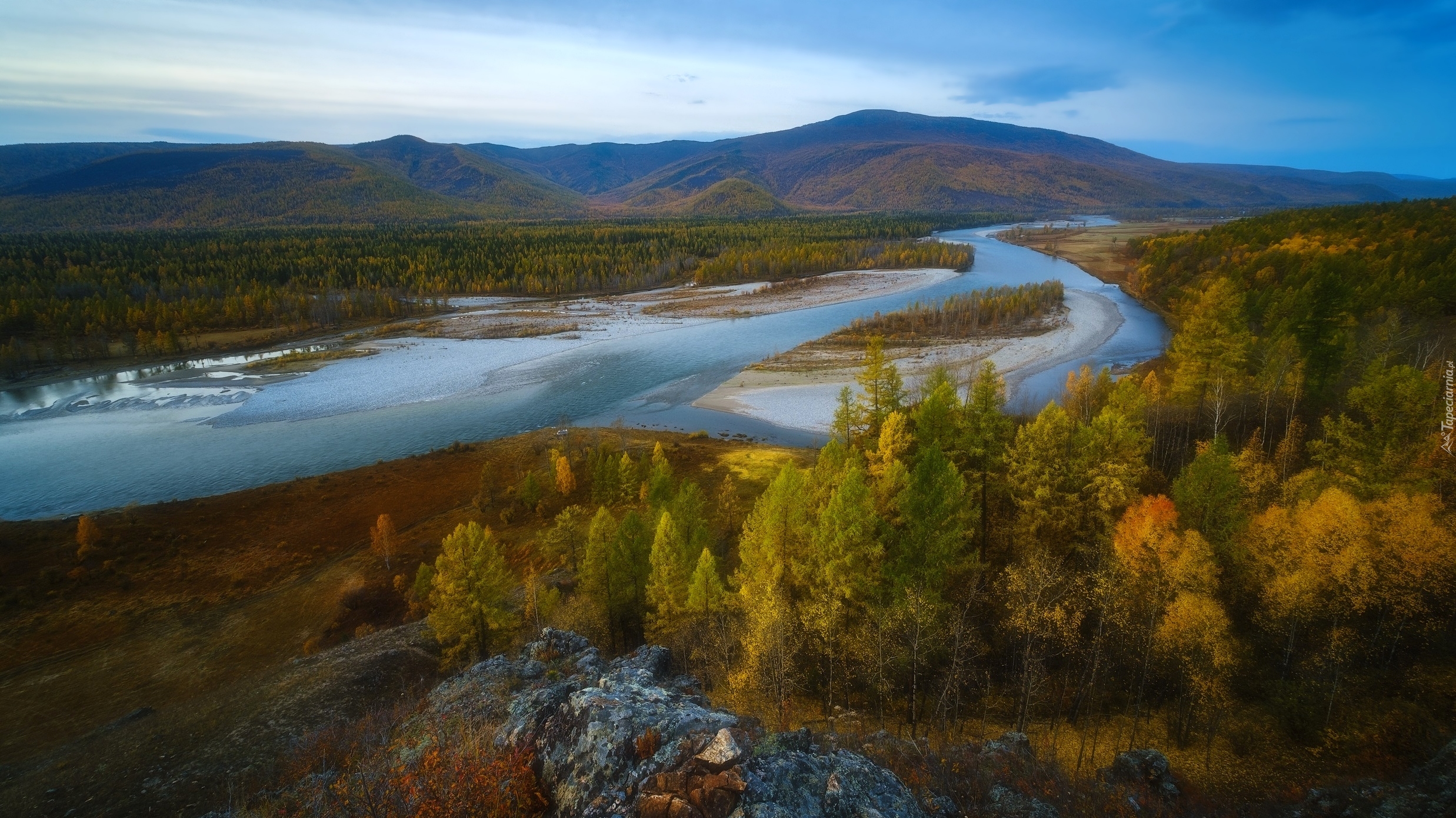 Edytor tapety: Rzeka na płaskowyżu pośród jesiennych lasów