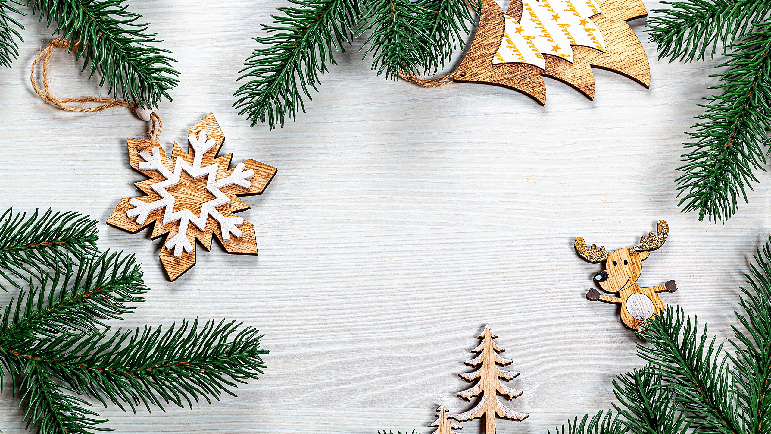 Edytor tapety: Drewniane ozdoby świąteczne obok gałązek świerku