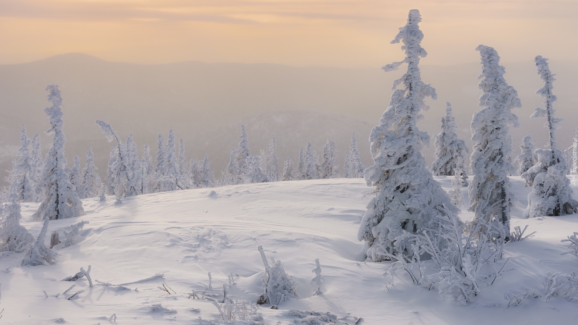 Edytor tapety: Ośnieżone drzewa z widokiem na zamglone góry
