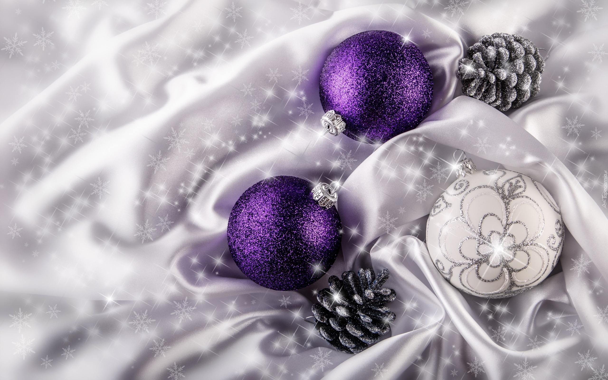 Edytor tapety: Bombki i szyszki na białym materiale