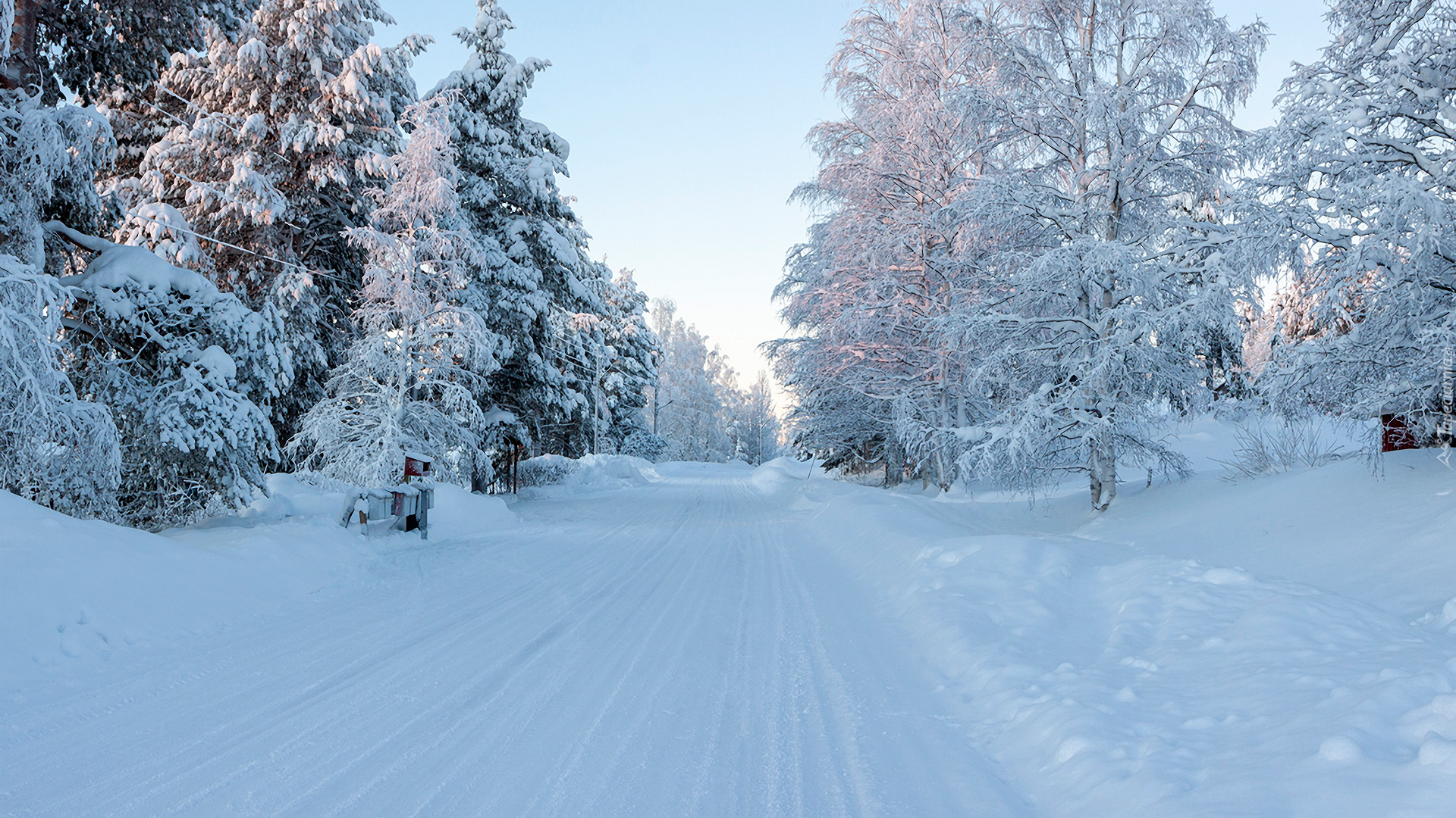 Edytor tapety: Droga w lesie pomiędzy ośnieżonymi drzewami