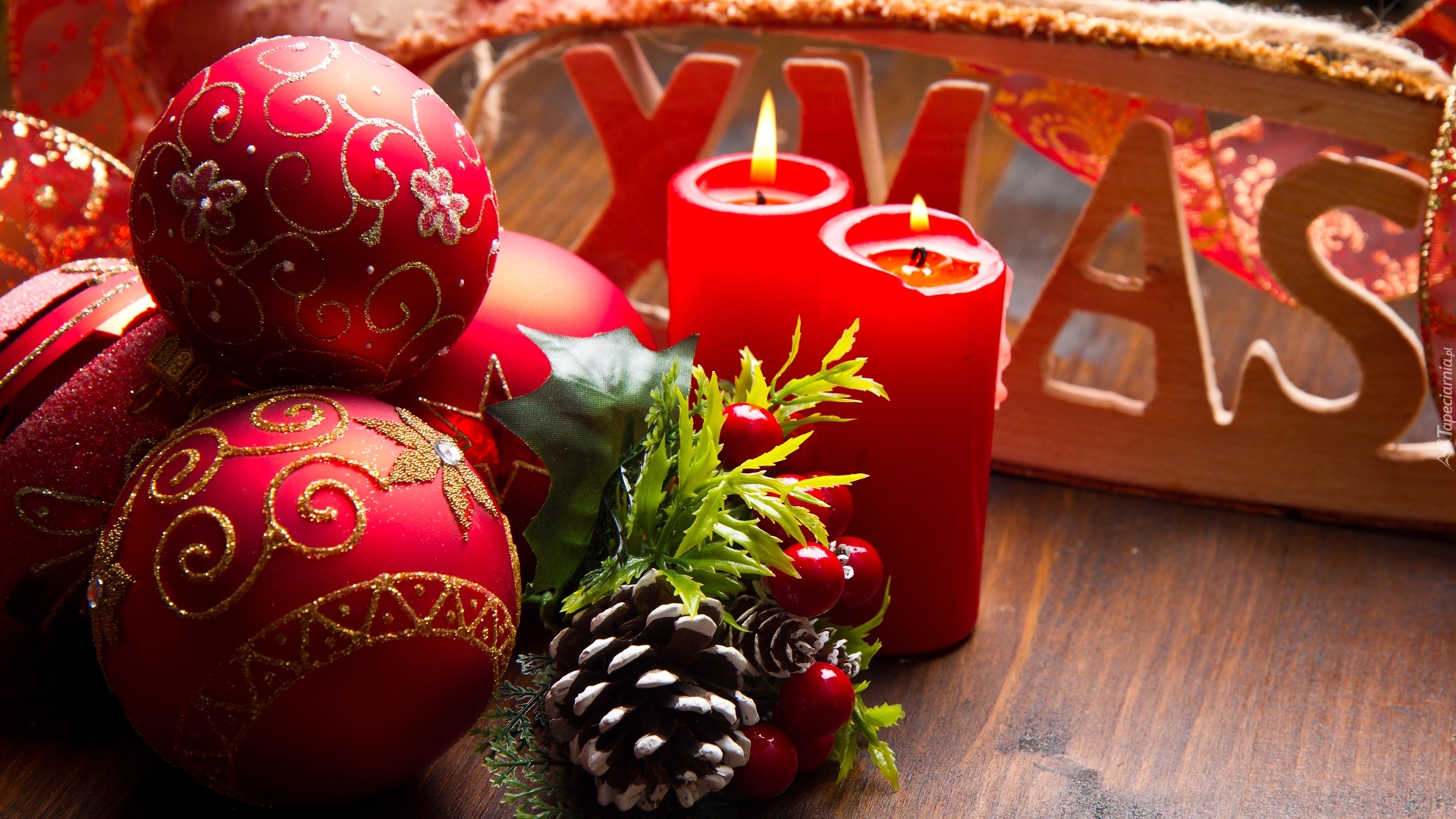 Edytor tapety: Bombki obok zapalonych świec i szyszek