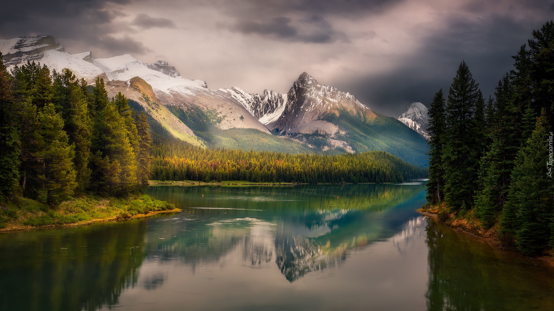 Edytor tapety: Lasy nad jeziorem Maligne w Kanadzie