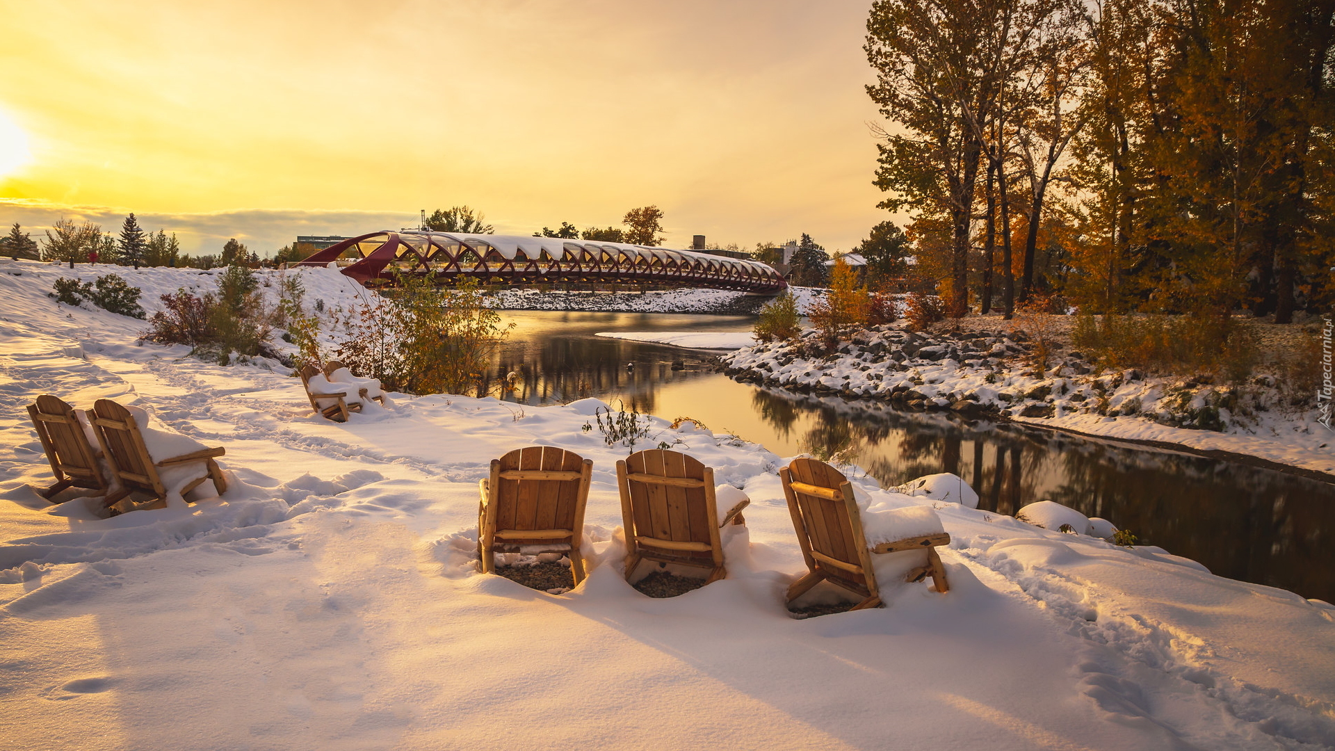 Edytor tapety: Zaśnieżone krzesła nad rzeką Bow