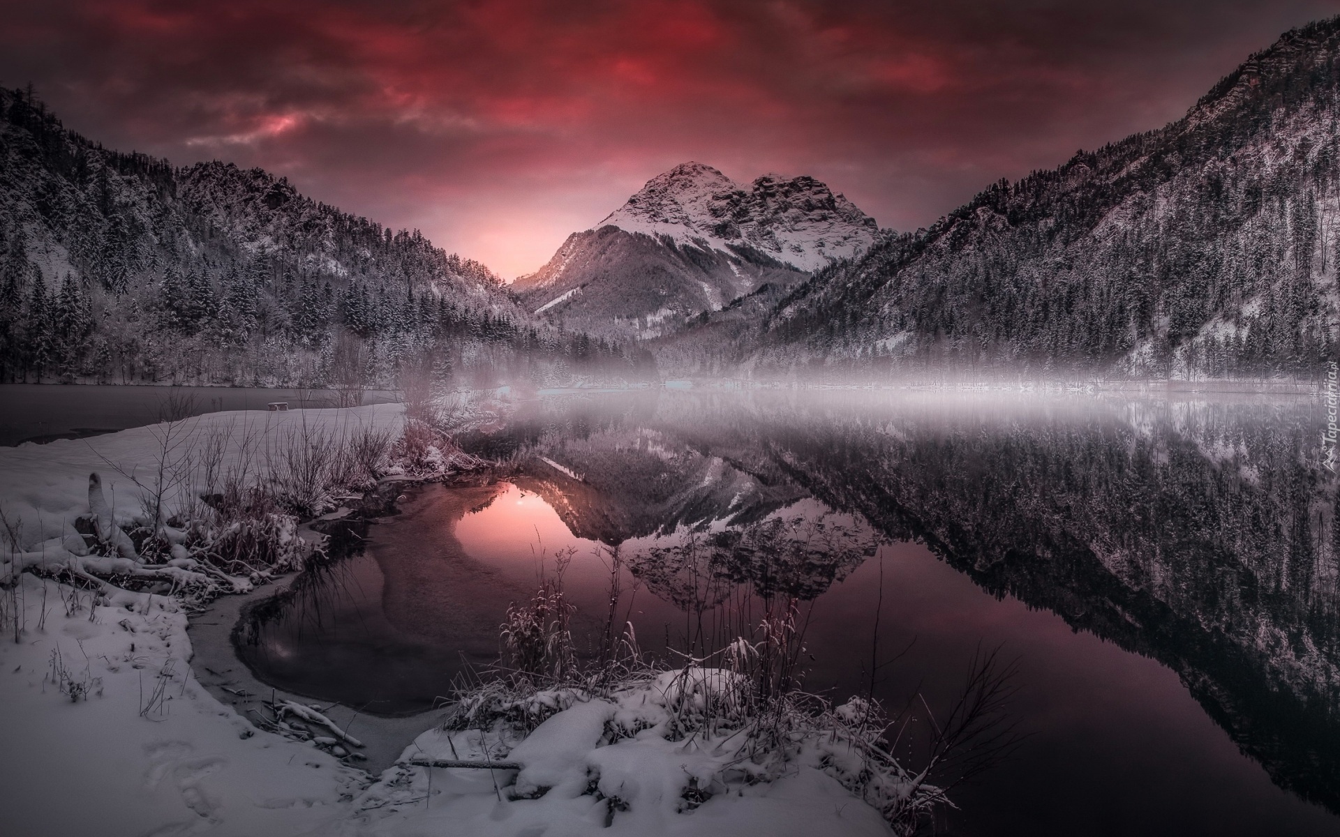 Edytor tapety: Ośnieżone górskie jezioro o zachodzie słońca