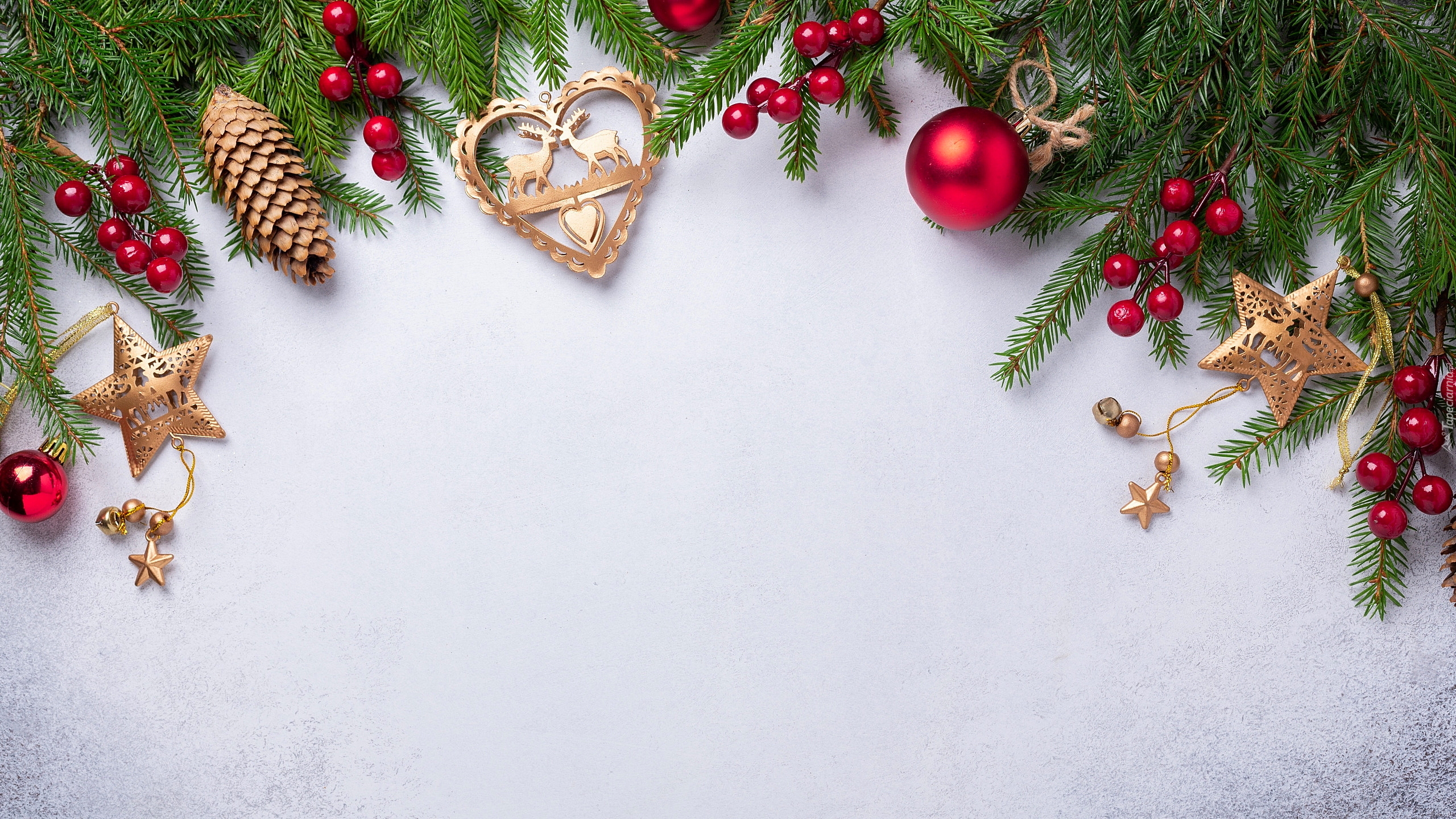 Edytor tapety: Udekorowane bombkami i szyszkami gałązki choinki