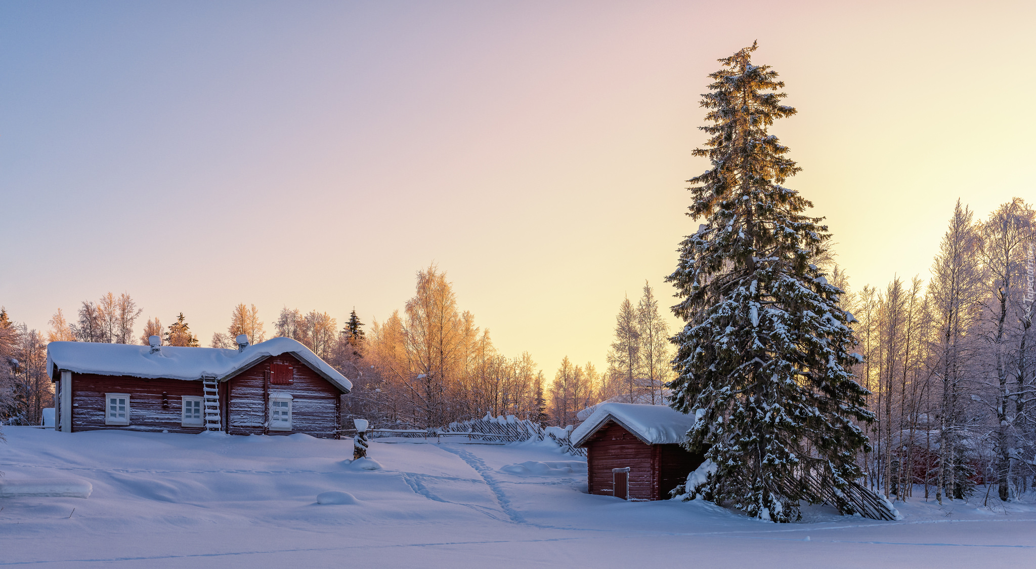Edytor tapety: Ośnieżone domy na skraju lasu