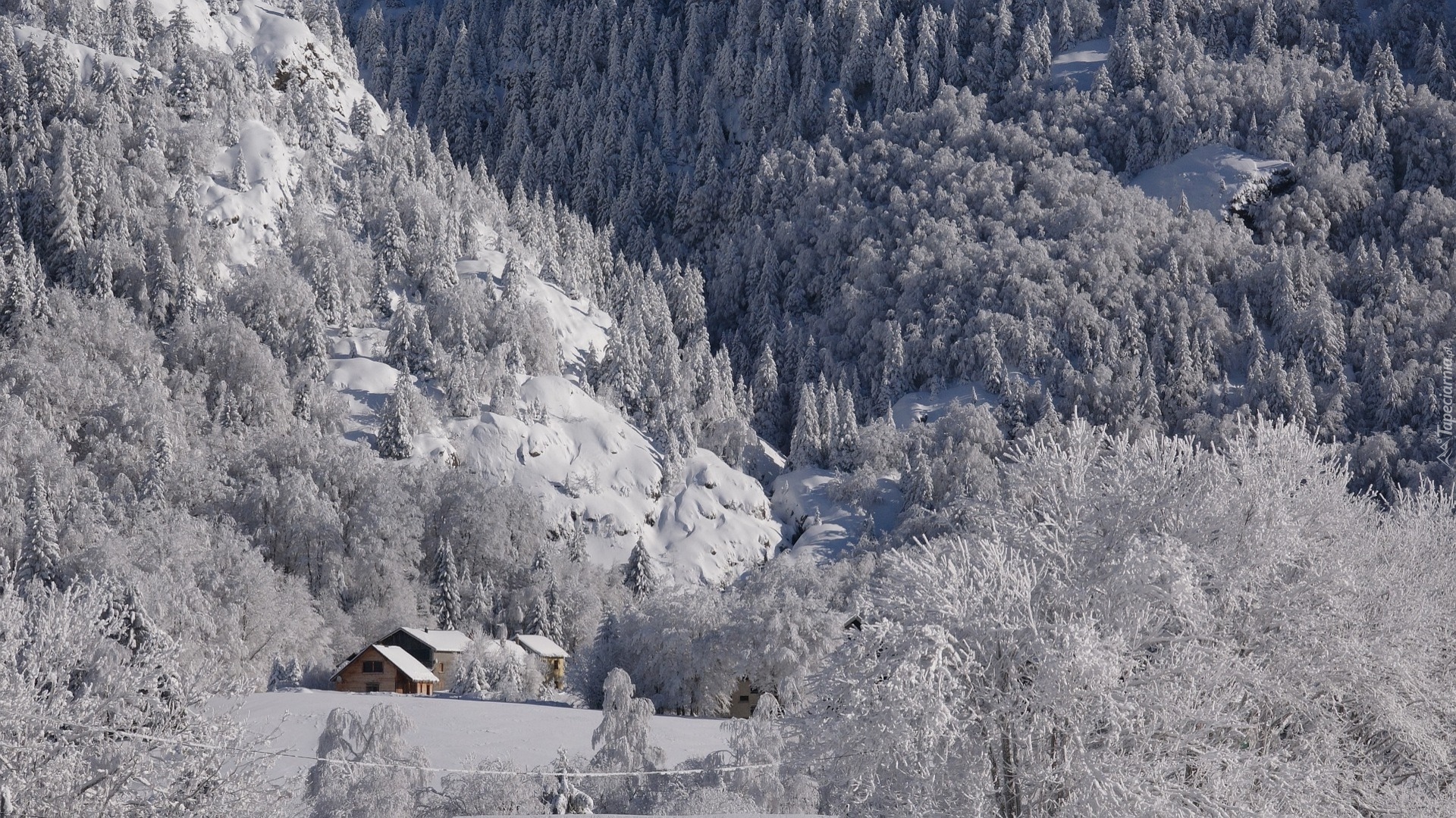 Edytor tapety: Domy pod ośnieżonym lasem w górach