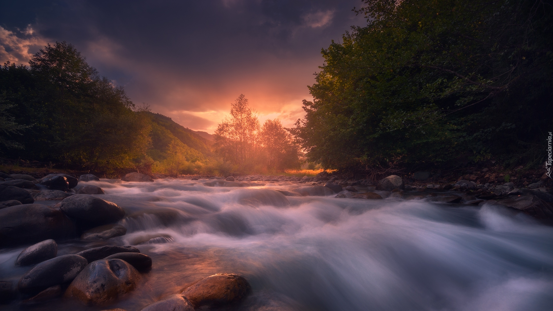 Edytor tapety: Zachód słońca nad rwącą rzeką