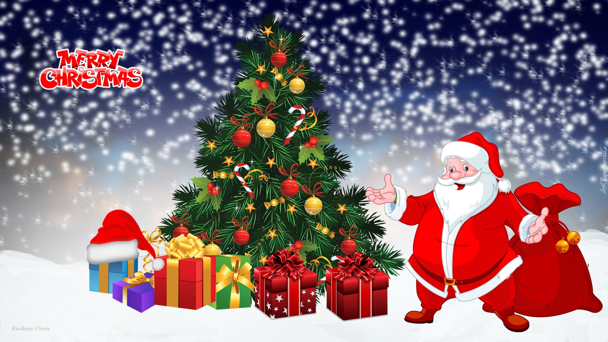 Edytor tapety: Mikołaj przy choince z prezentami