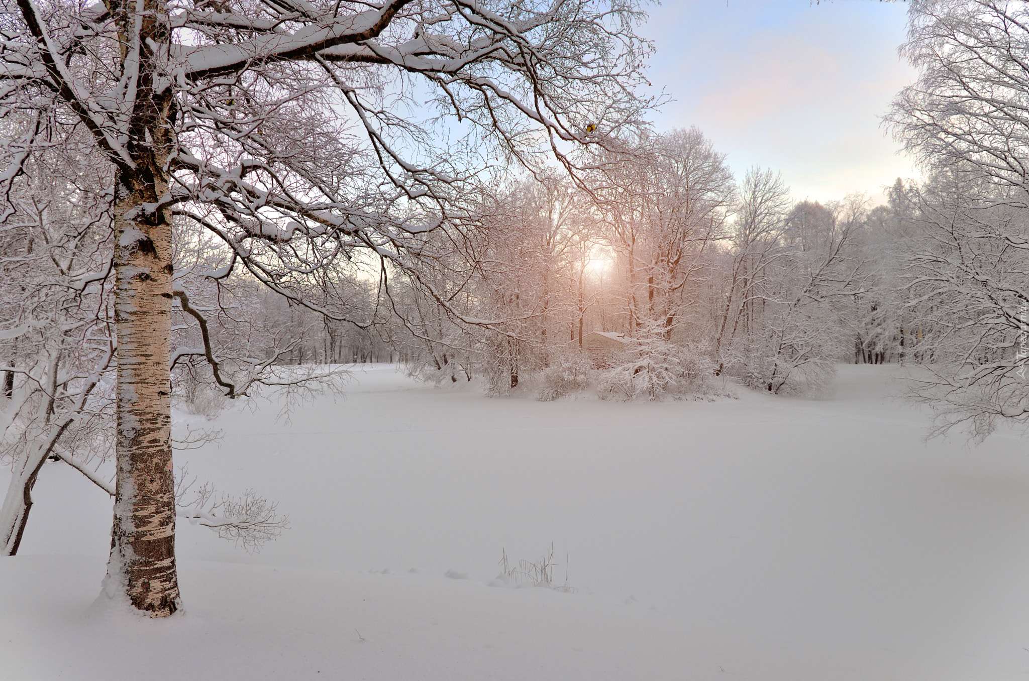 Edytor tapety: Zamglone słońce między ośnieżonymi drzewami
