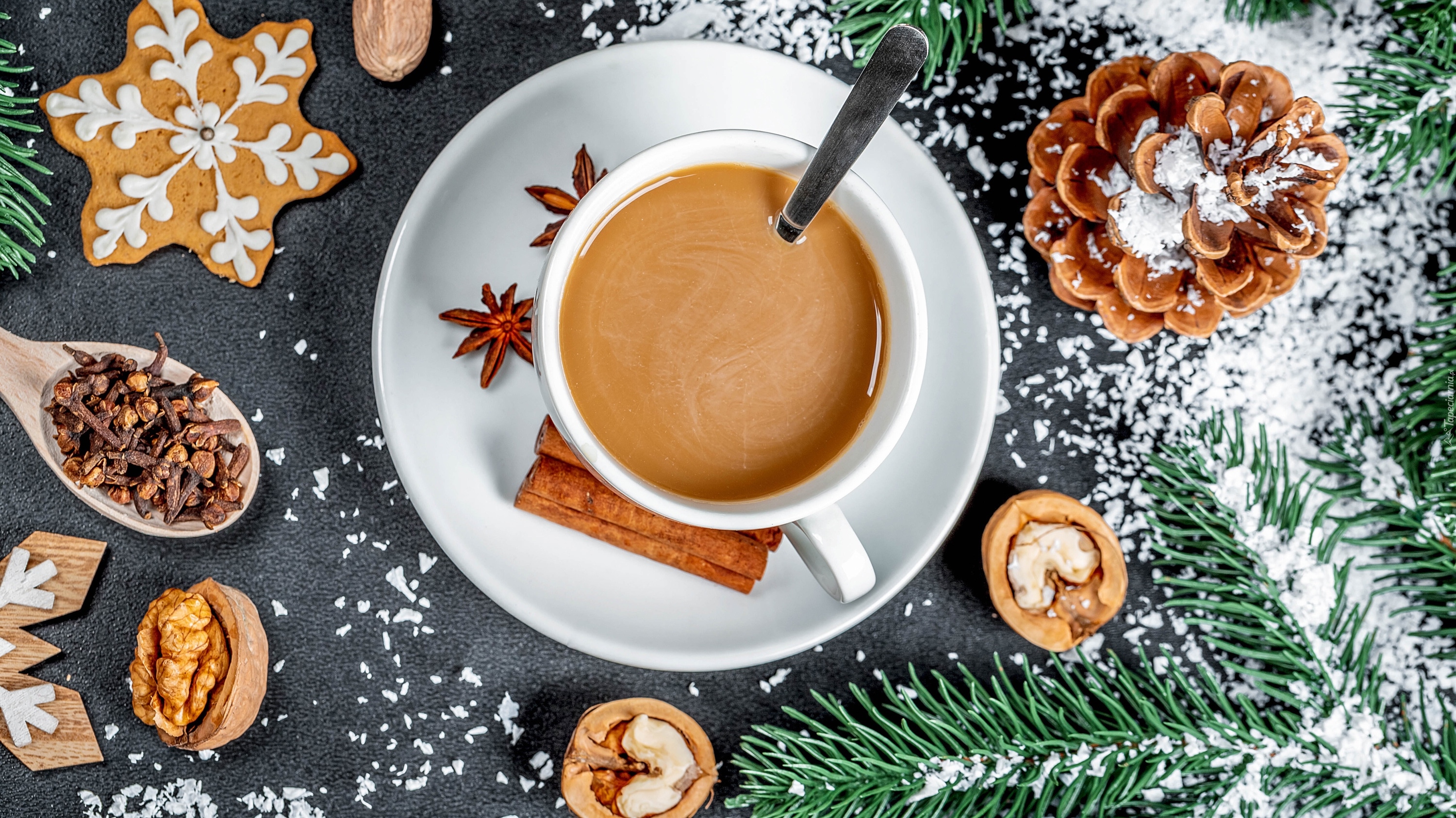 Edytor tapety: Filiżanka z kawą wśród orzechów i przypraw korzennych