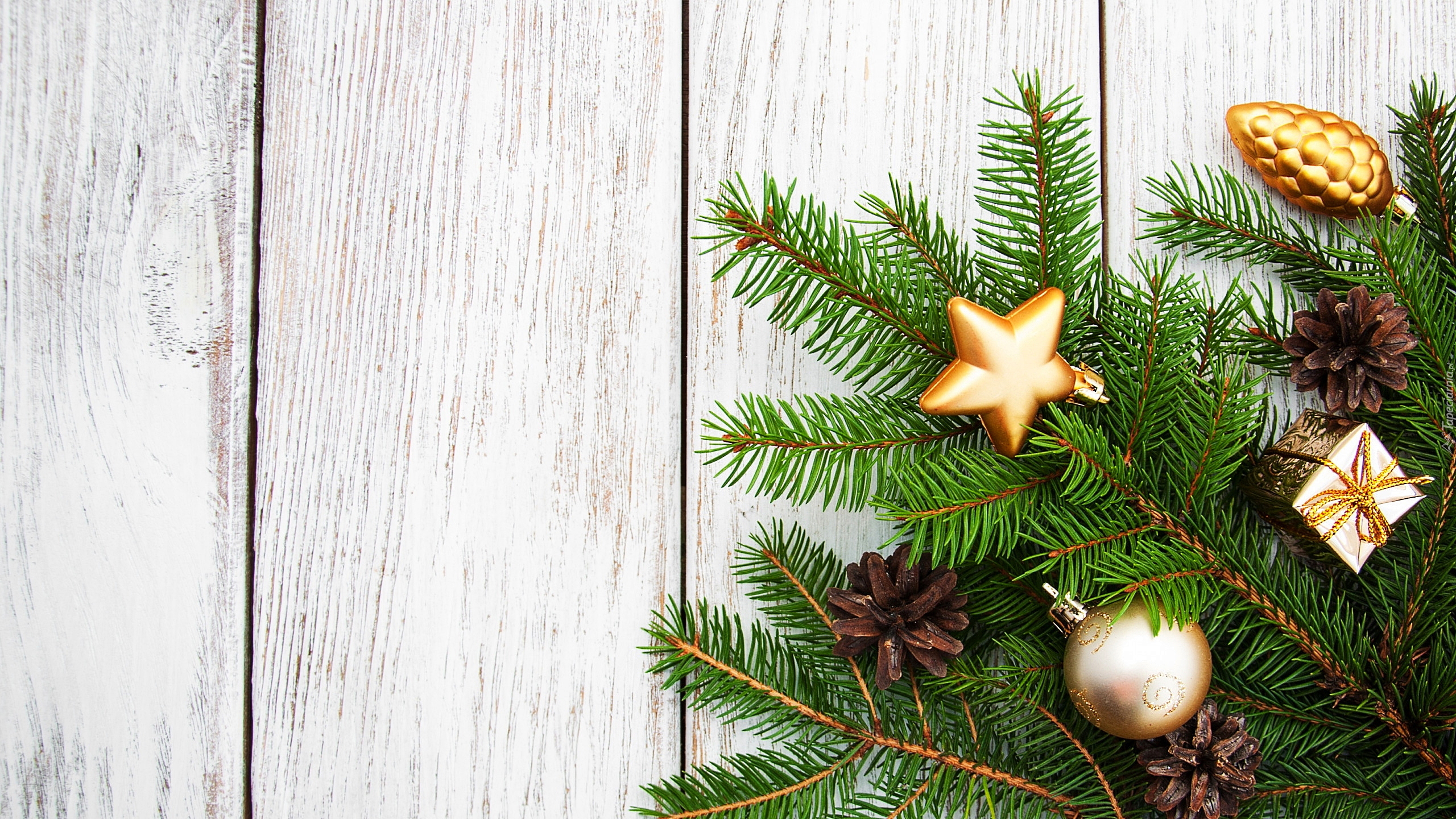 Edytor tapety: Złote bombki na zielonych gałązkach