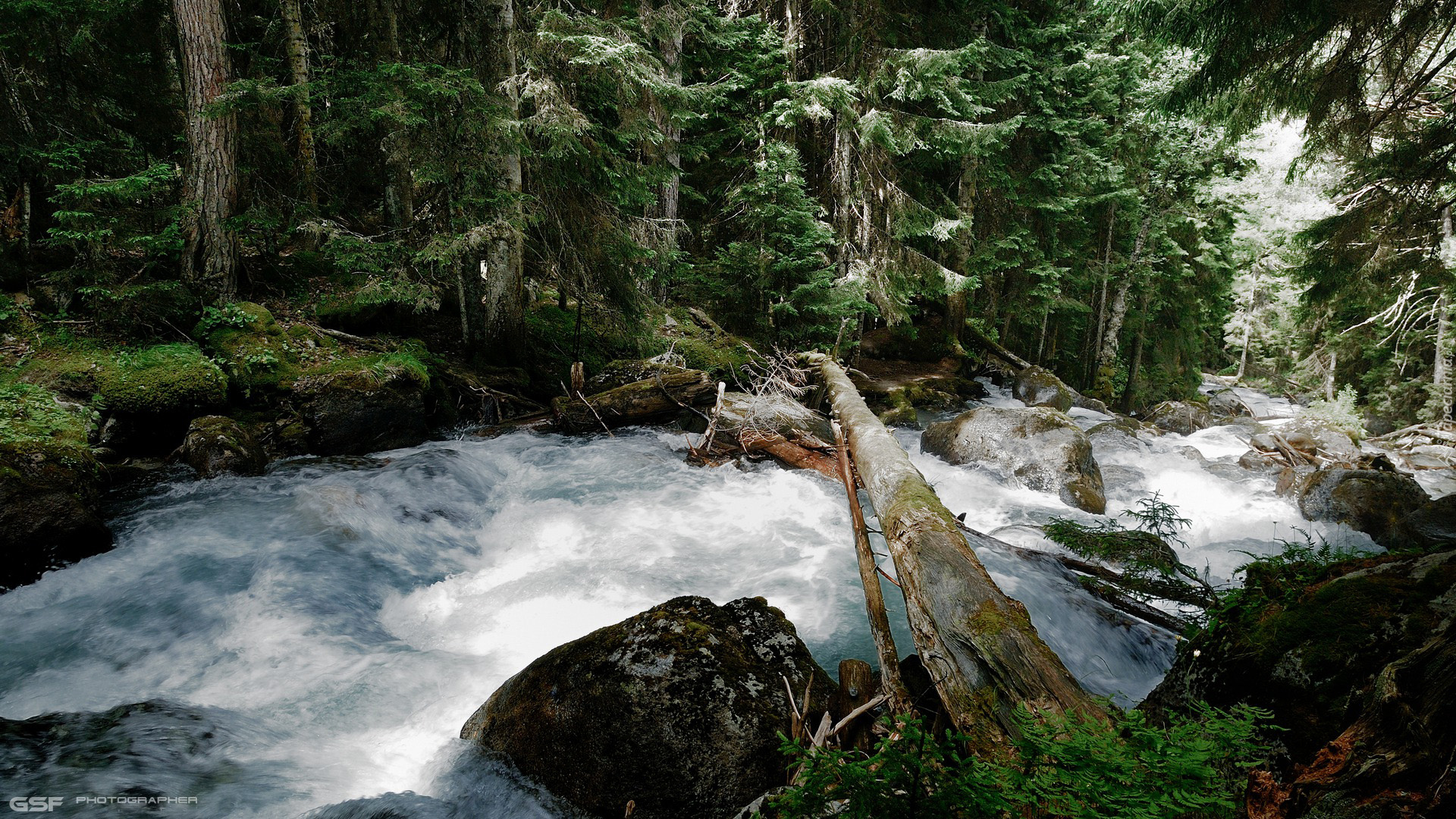 Edytor tapety: Powalone drzewo na rwącej leśnej rzece