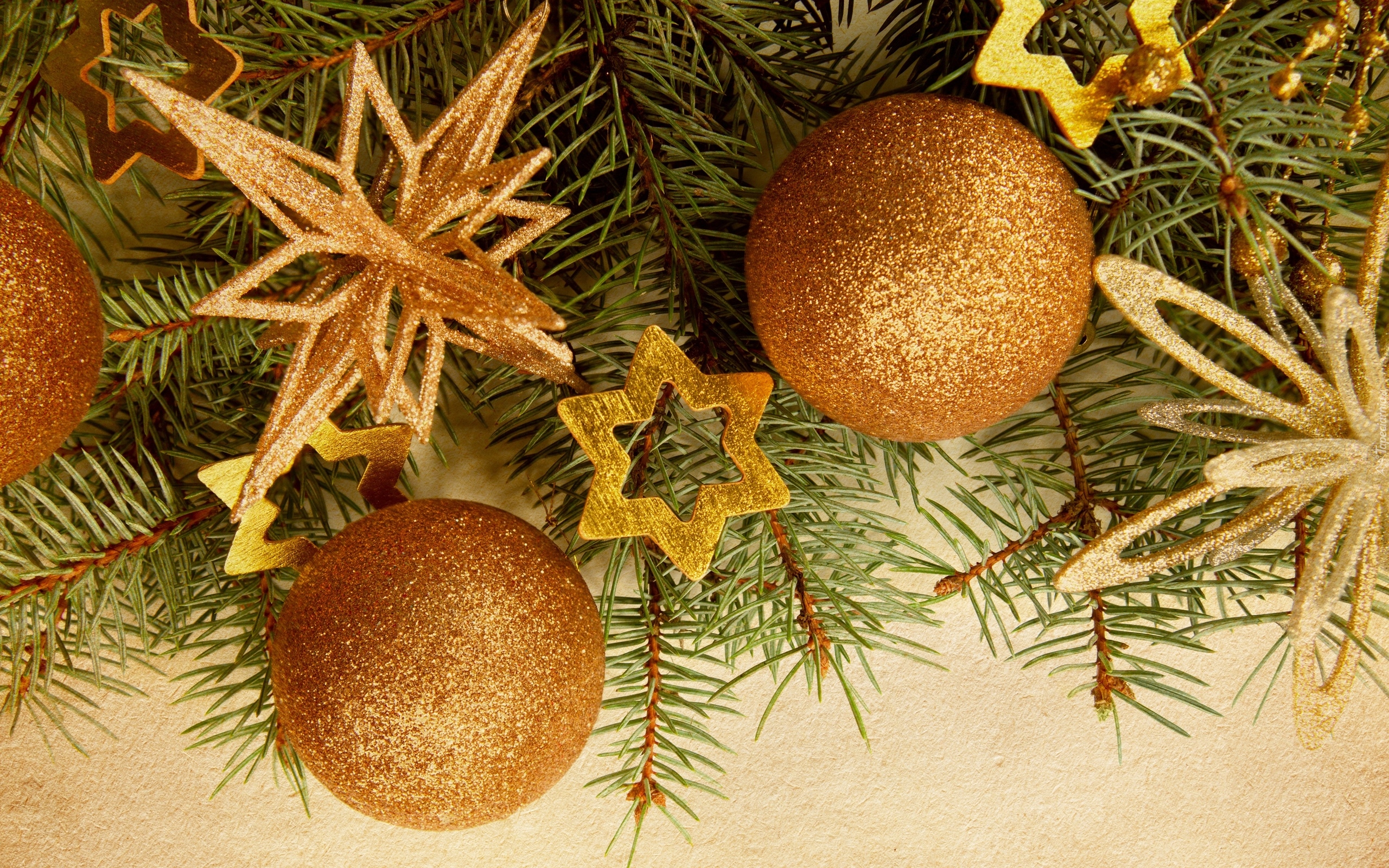 Edytor tapety: Złote gwiazdki i bombki na świerkowych gałązkach