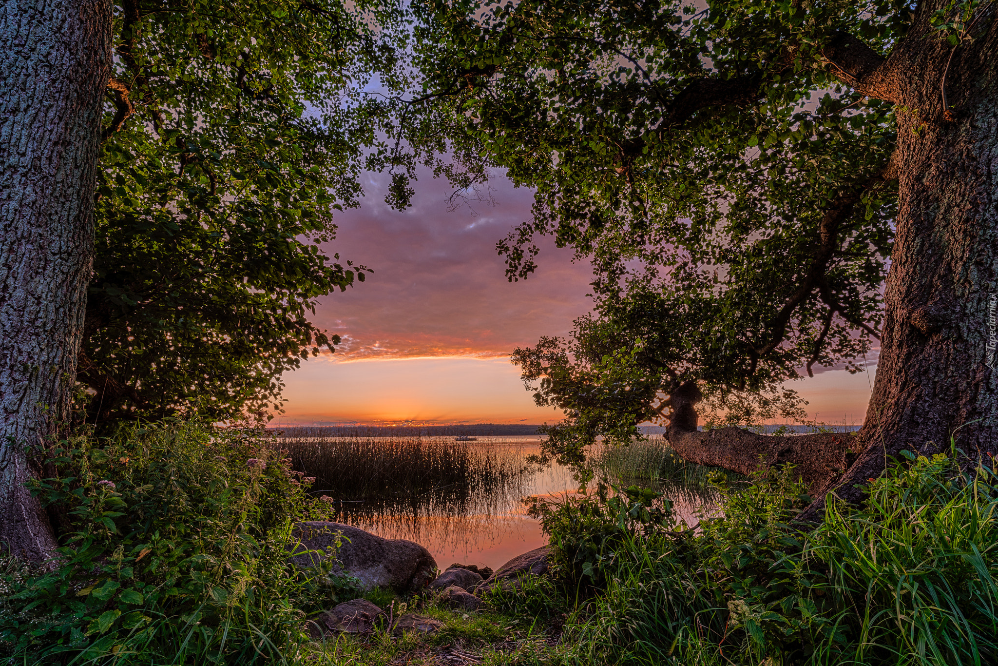 Edytor tapety: Drzewa na brzegu jeziora w blasku zachodzącego słońca