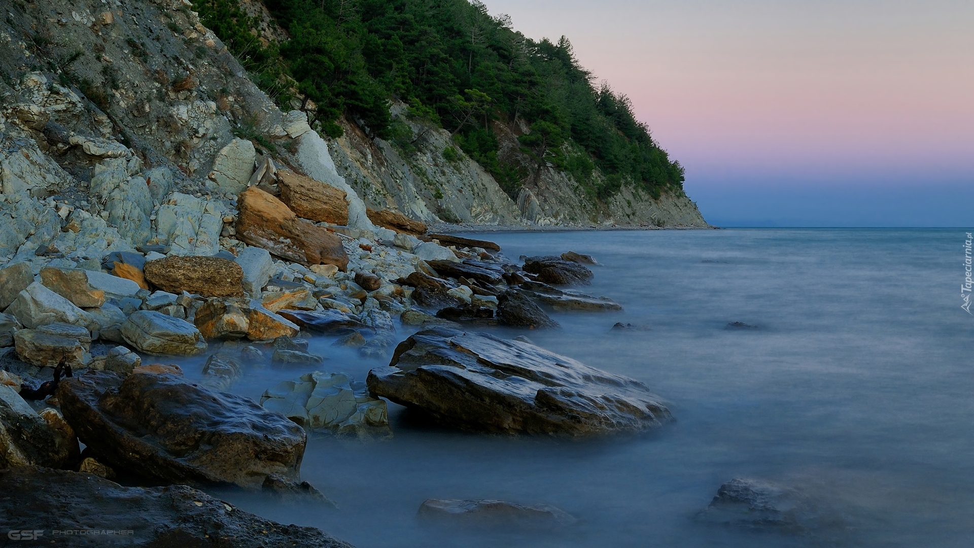 Edytor tapety: Skały nad morzem porośnięte drzewami