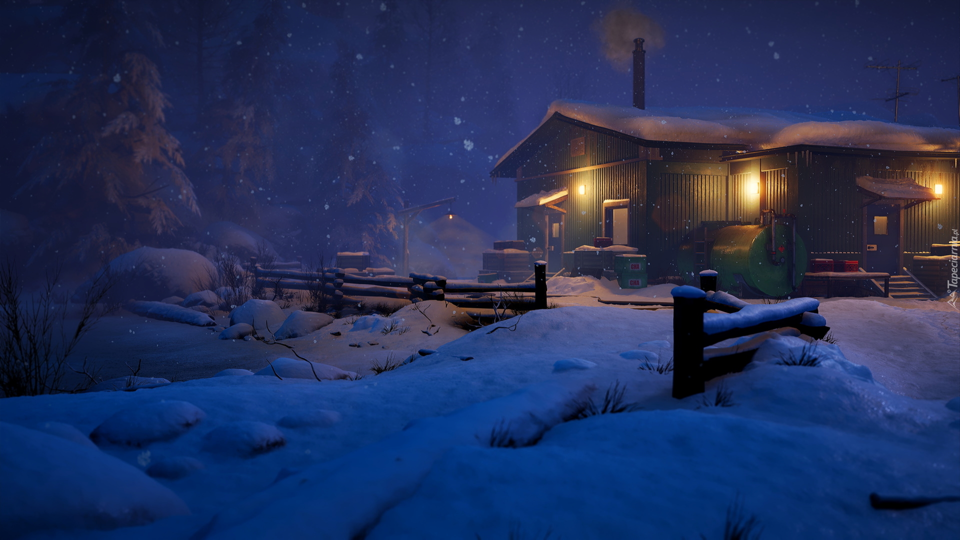 Edytor tapety: Oświetlony dom zimą w grafice