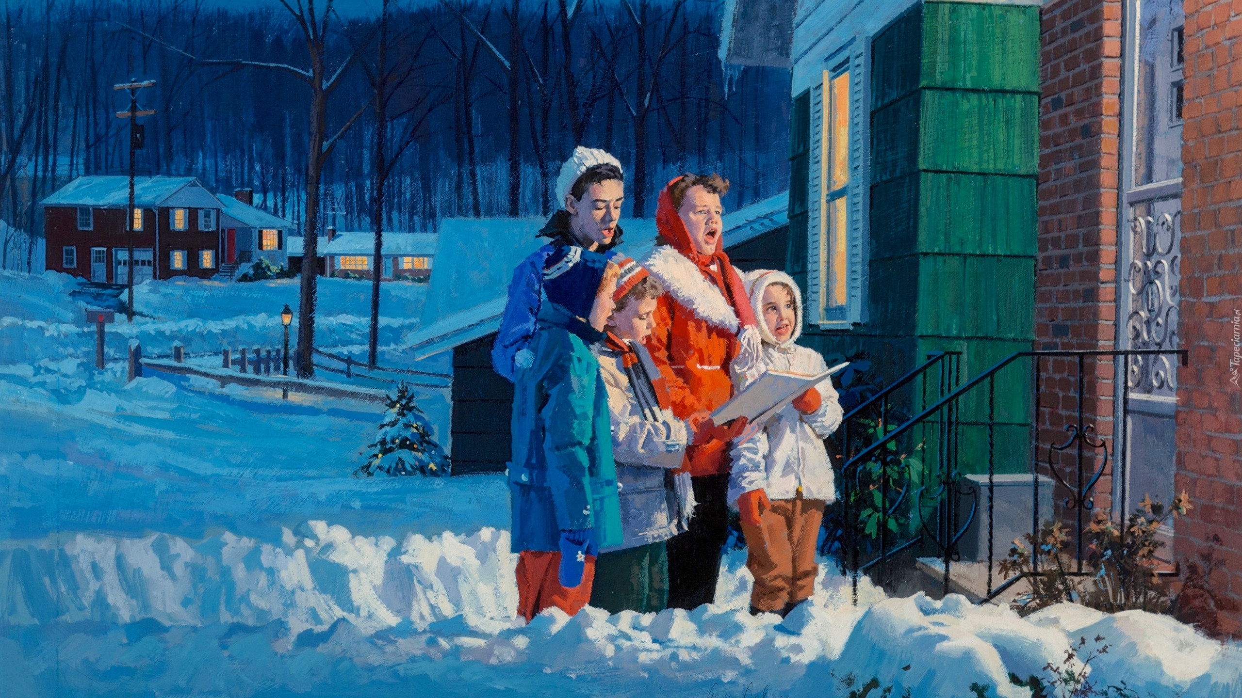 Edytor tapety: Śpiewające dzieci przed domem na obrazie Gordona Johnsona