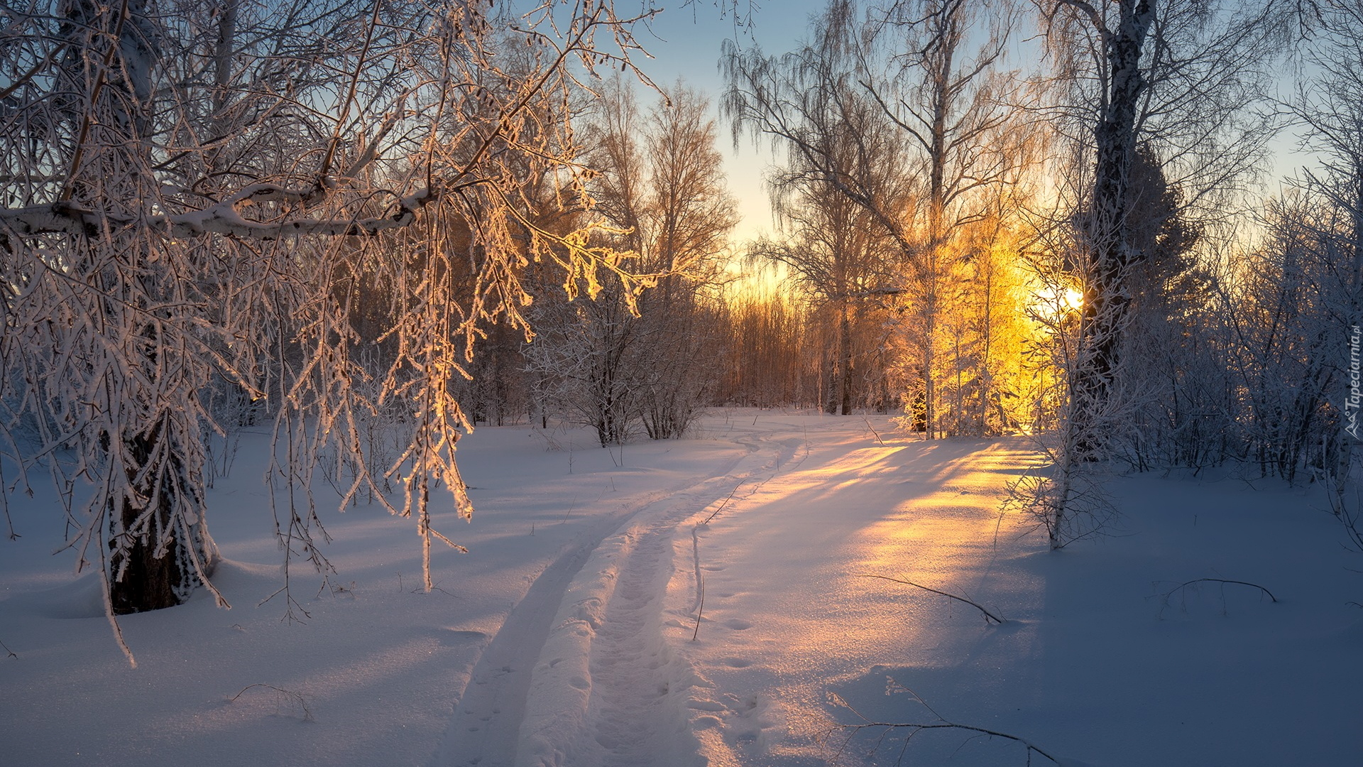 Edytor tapety: Oblodzone gałęzie na drzewie w promieniach słońca