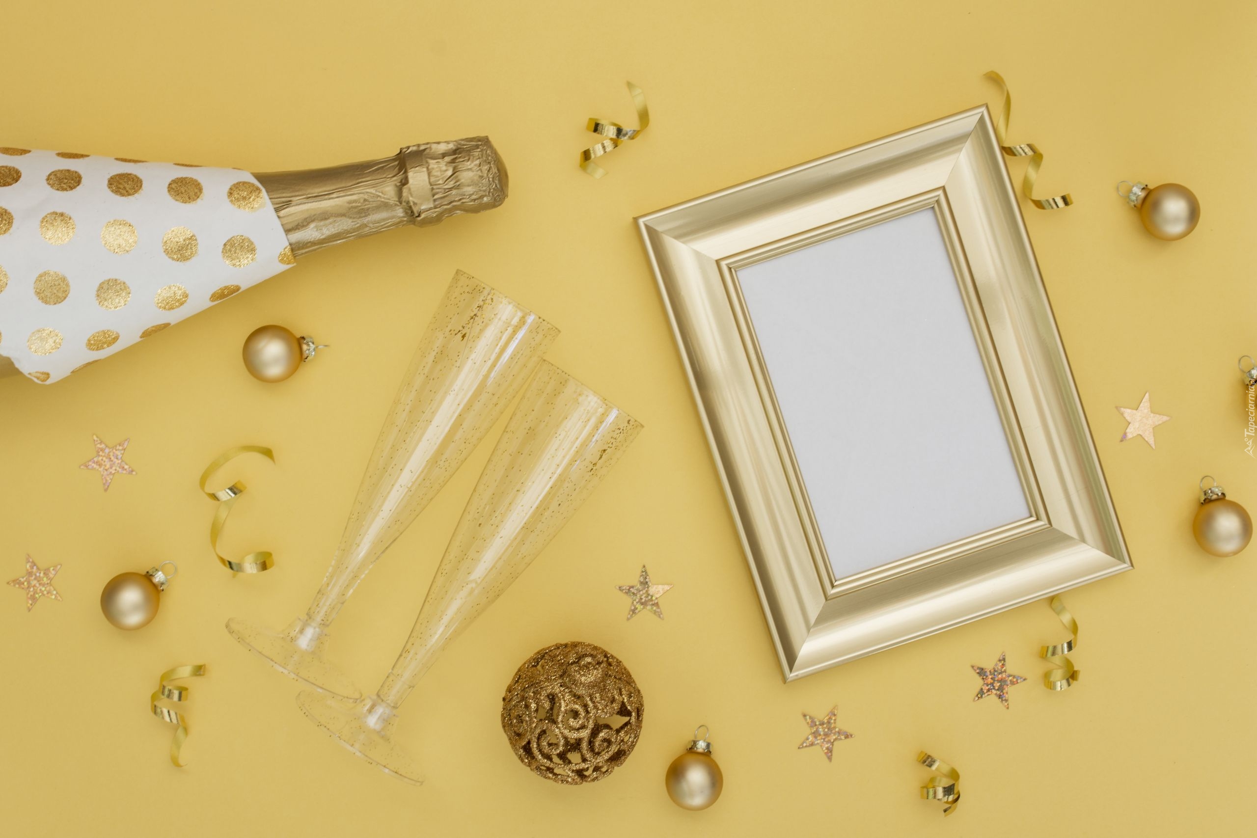 Edytor tapety: Kieliszki obok ramki i butelki szampana