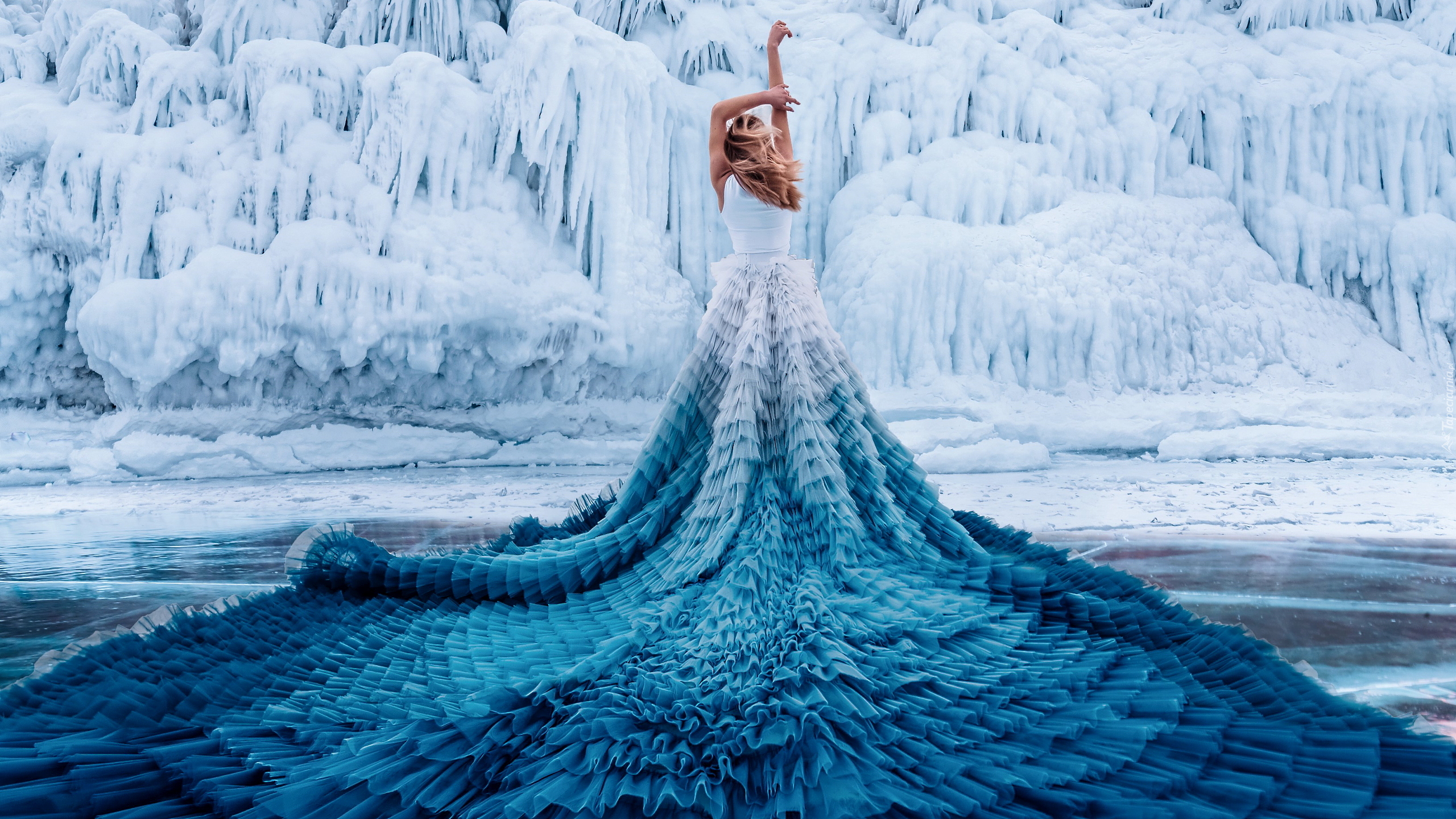 Edytor tapety: Kobieta w długiej sukni na tle sopli lodowych