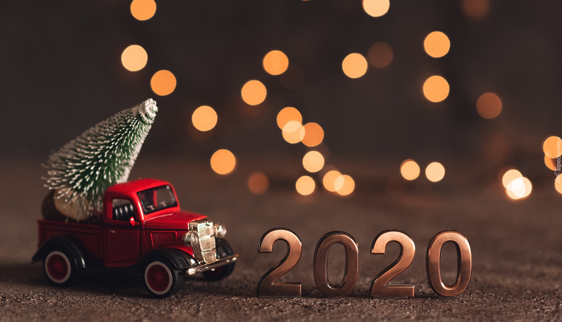 Edytor tapety: Cyfry 2020 obok samochodu z choinką