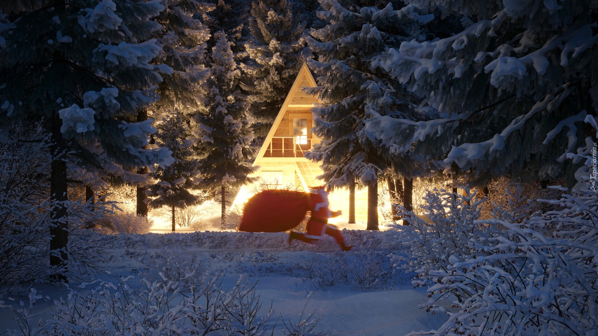 Edytor tapety: Mikołaj z workiem przed oświetlonym domem