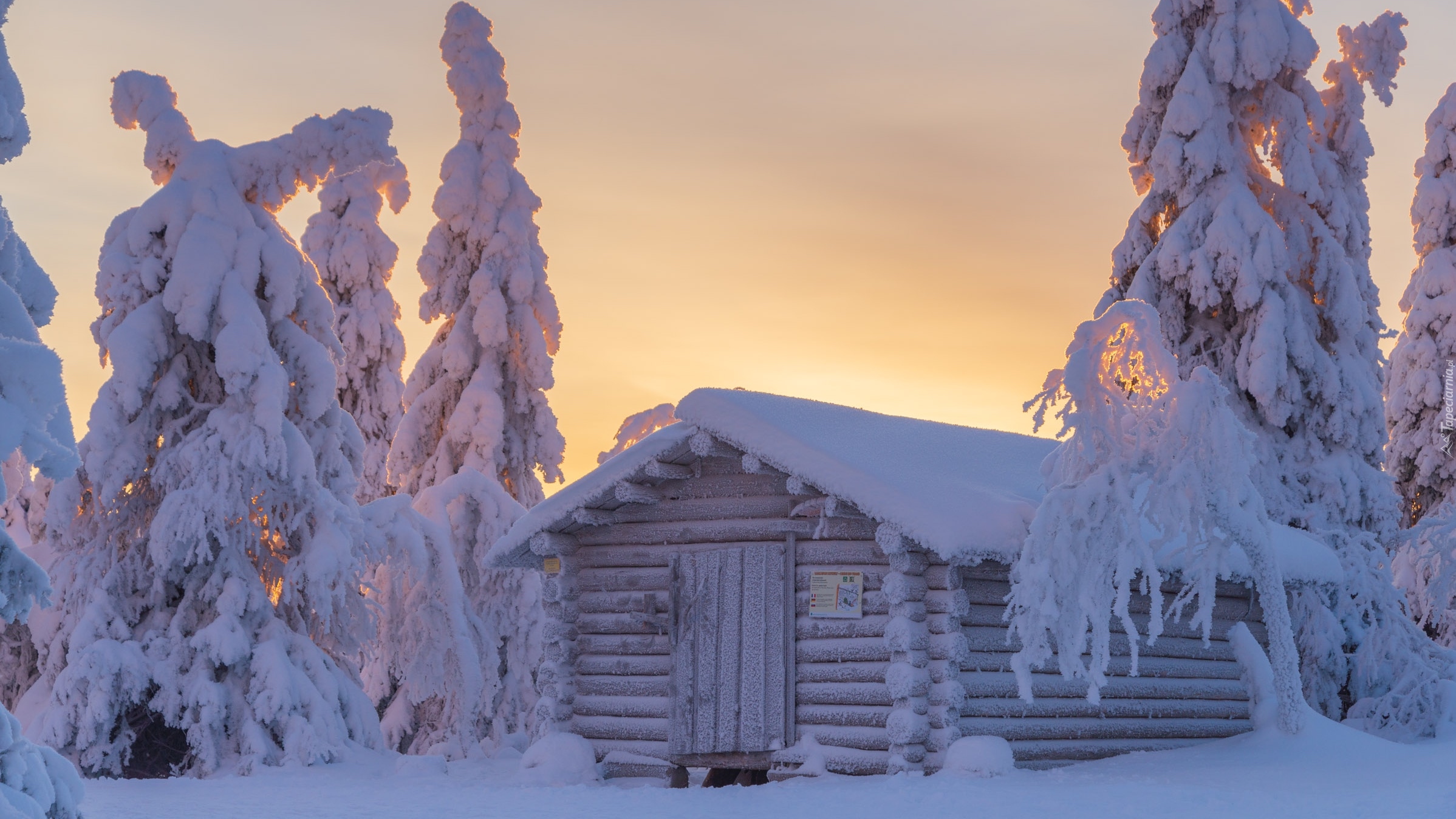 Edytor tapety: Ośnieżona drewniana chata i świerki