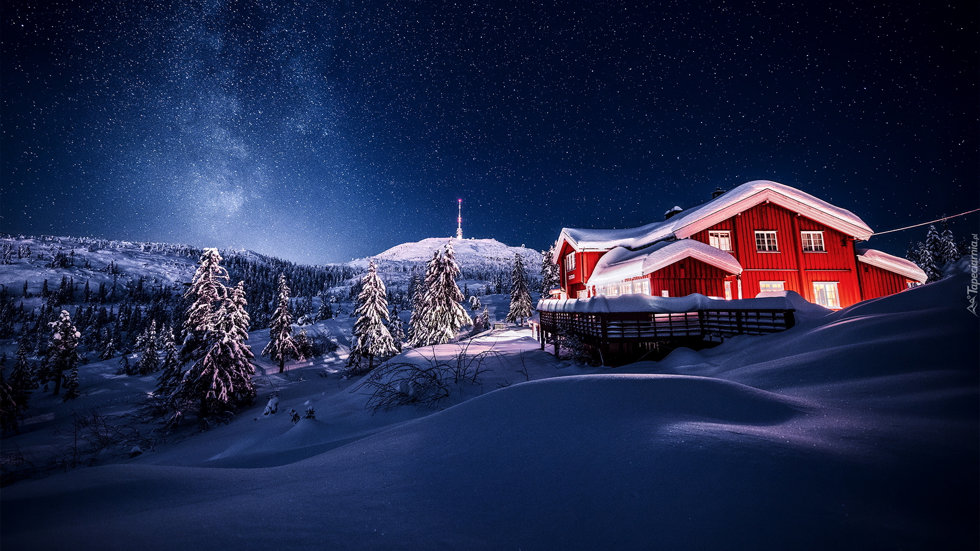 Edytor tapety: Ośnieżony dom pod gwiaździstym niebem