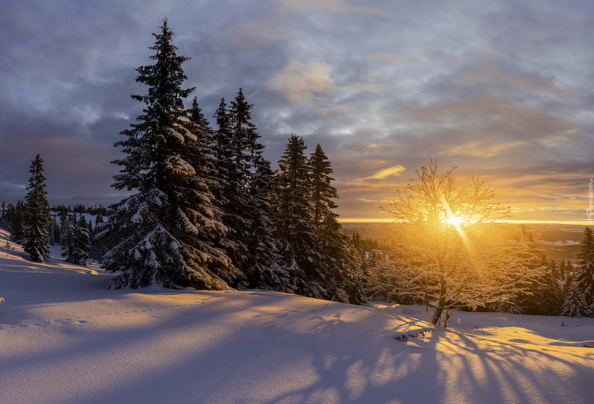 Edytor tapety: Drzewa w promieniach słońca zimową porą