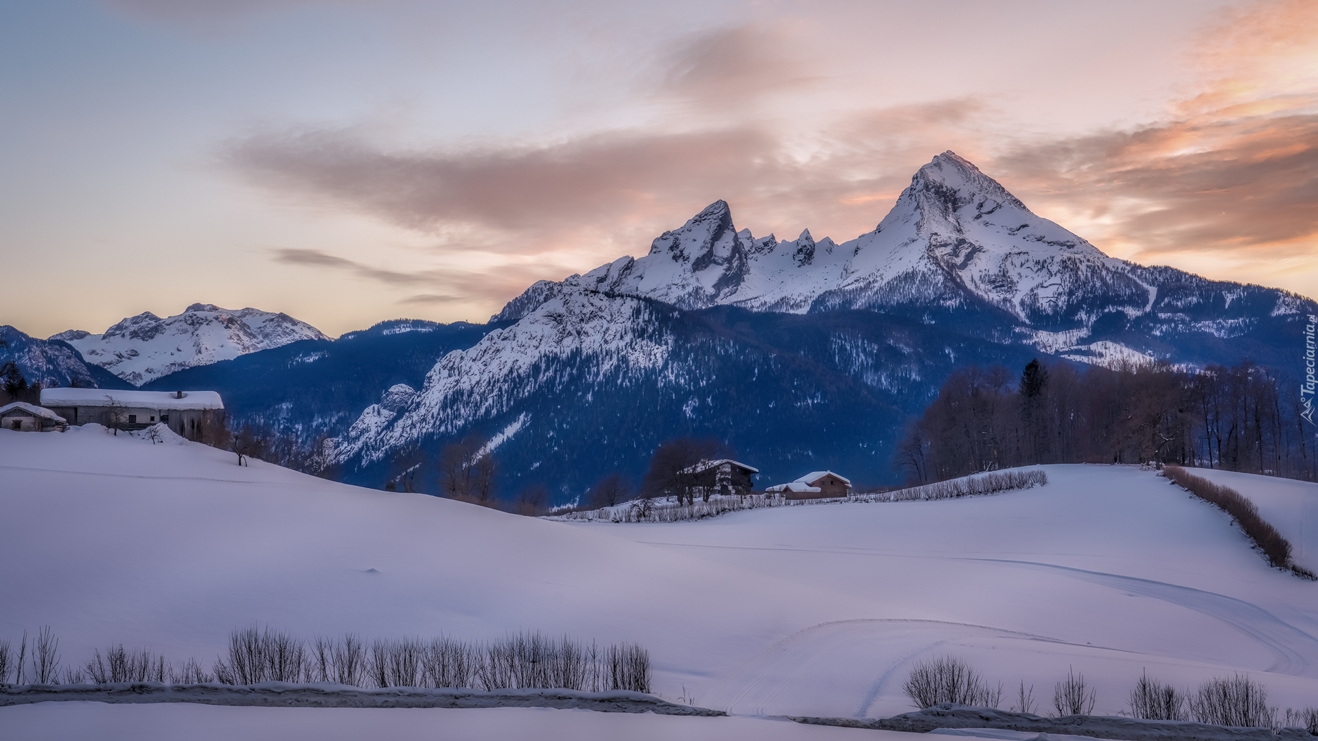 Edytor tapety: Domy w śniegu pod górami