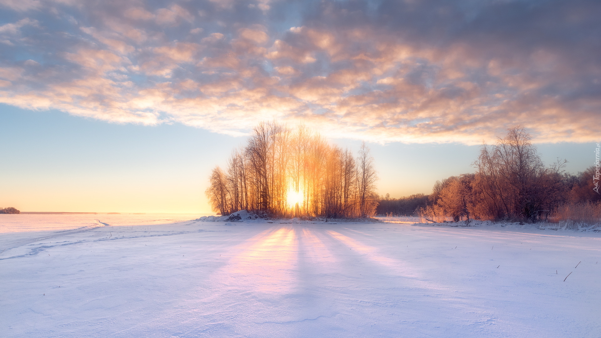 Edytor tapety: Rozświetlone słońcem drzewa na ośnieżonym polu