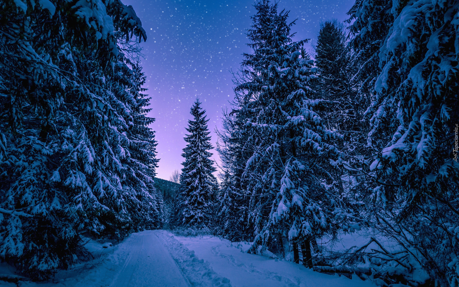 Edytor tapety: Gwiazdy nad ośnieżonymi drzewami w lesie