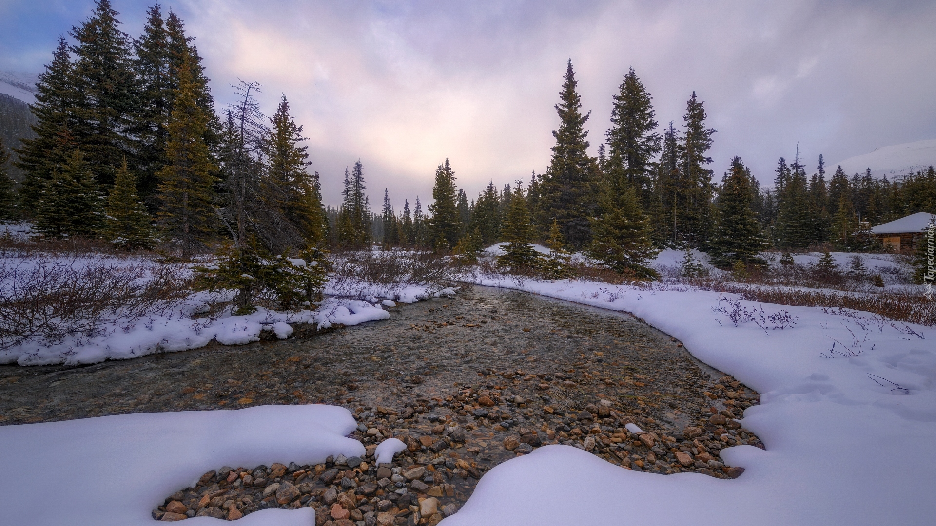 Edytor tapety: Śnieg na brzegu kamienistej rzeki