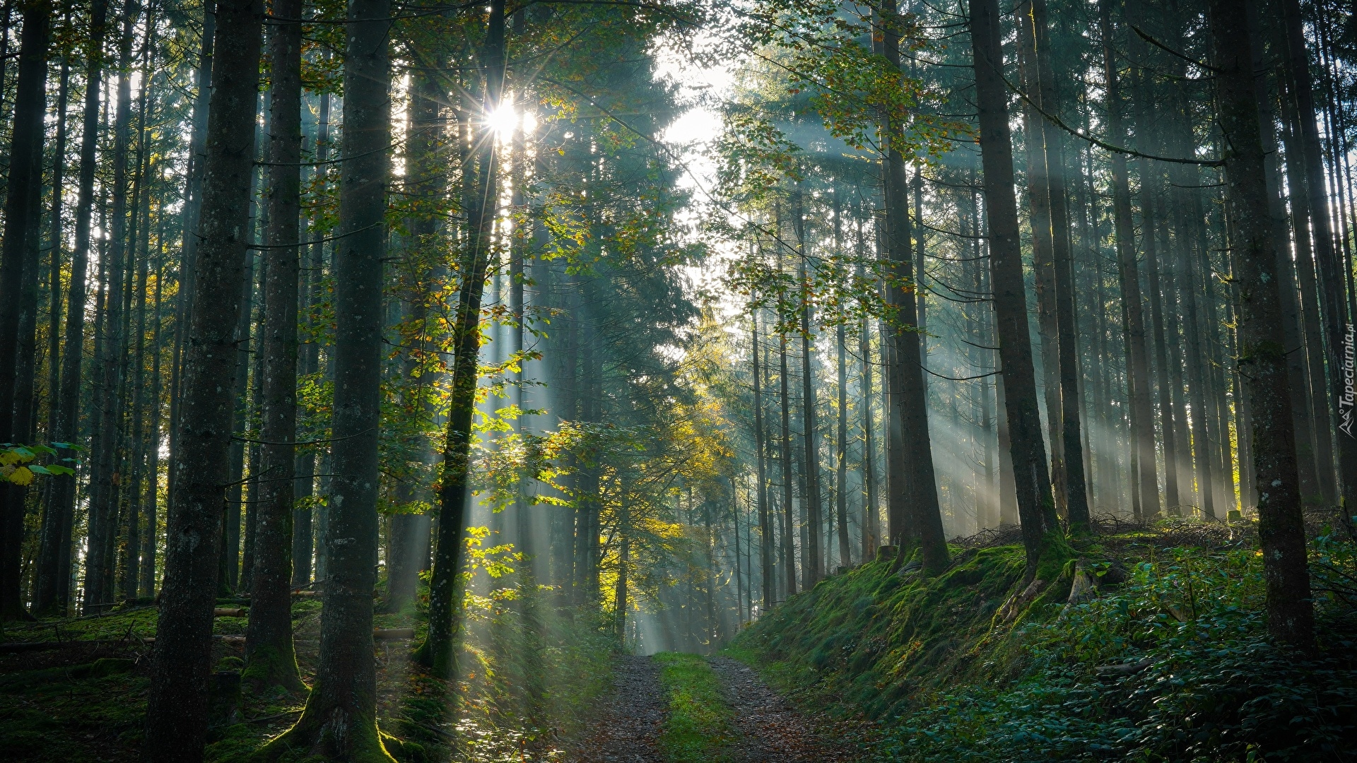 Edytor tapety: Promienie słońca w zielonym lesie