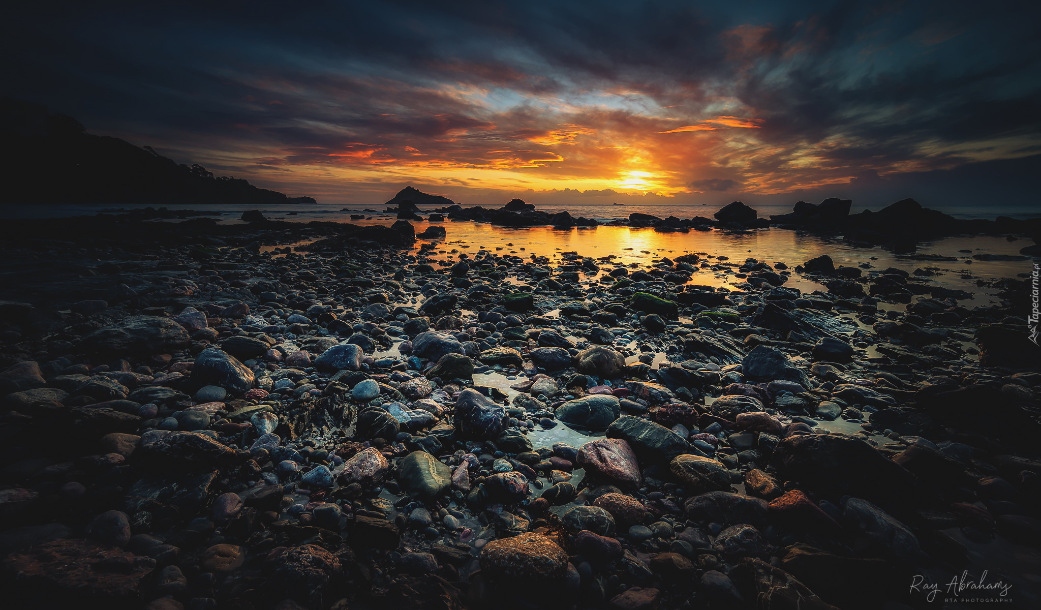 Edytor tapety: Kamieniste wybrzeże o zachodzie słońca
