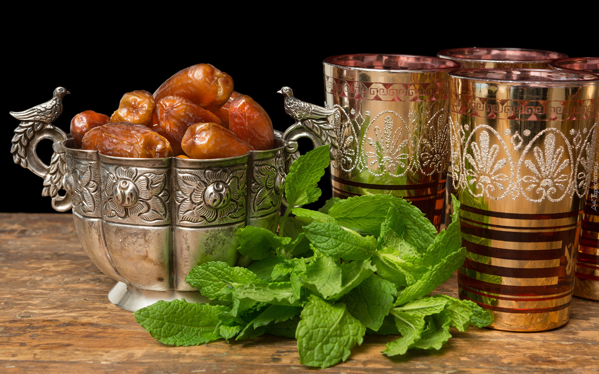 Edytor tapety: Daktyle w srebrnej miseczce obok szklanek