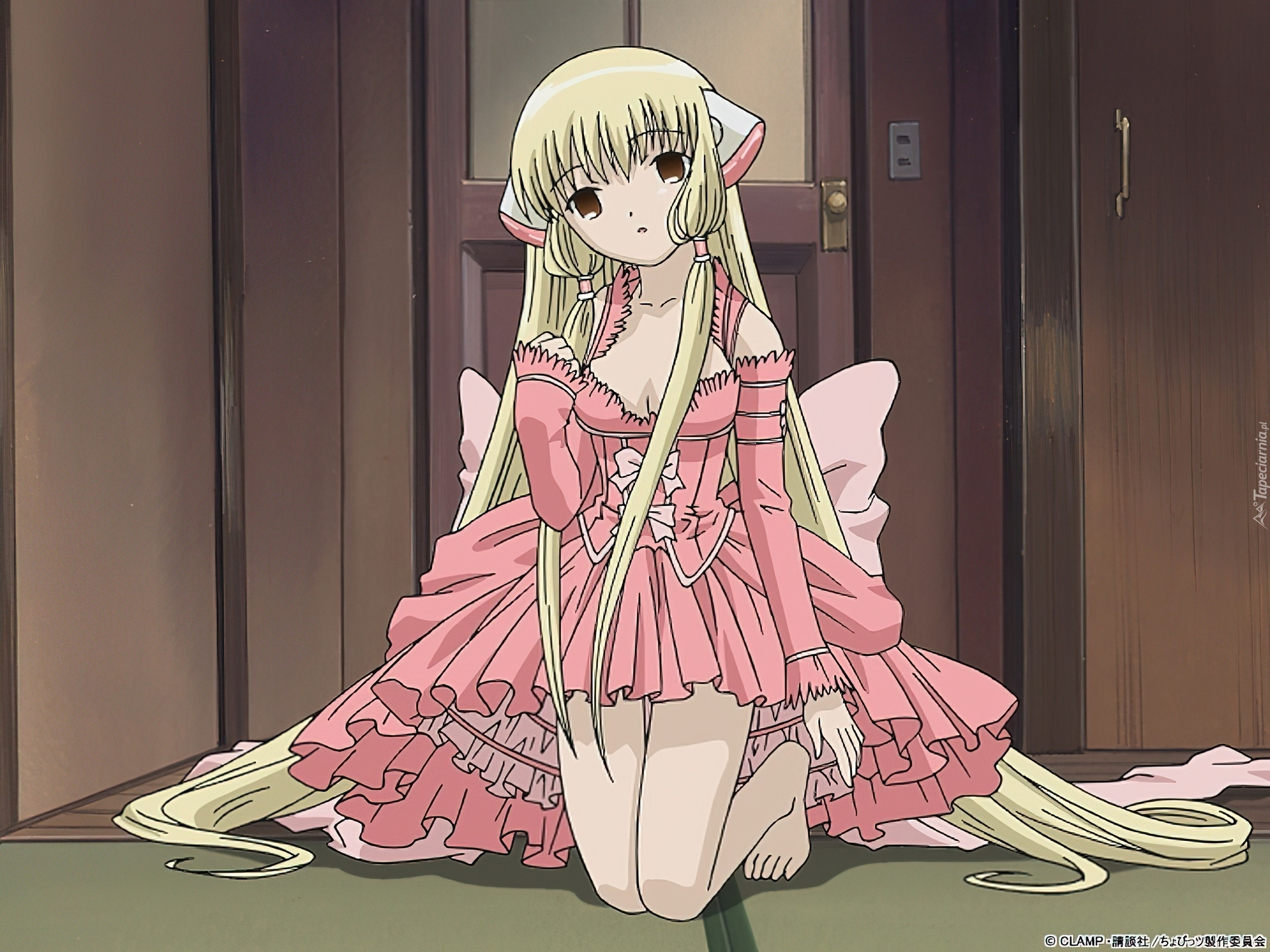 Edytor tapety: Chobits, dziewczyna, klęczy, drzwi, kokarda