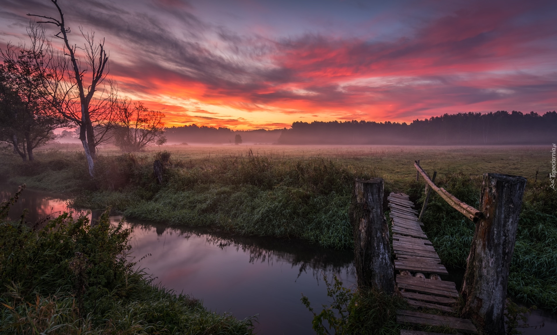 Edytor tapety: Zachód słońca nad zamglonymi łąkami przy rzeczce