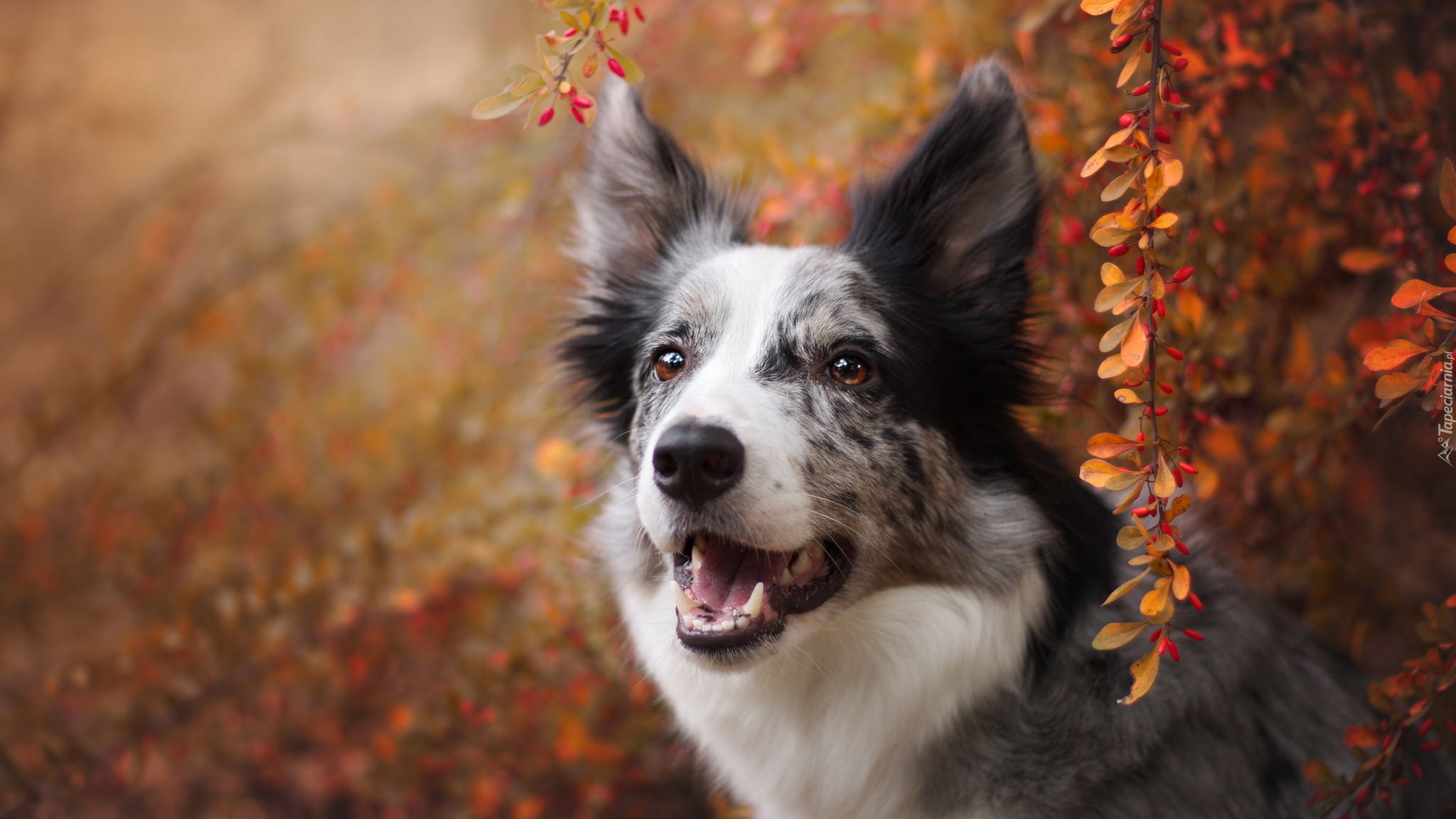 Edytor tapety: Border collie pod gałązkami jesiennego krzewu
