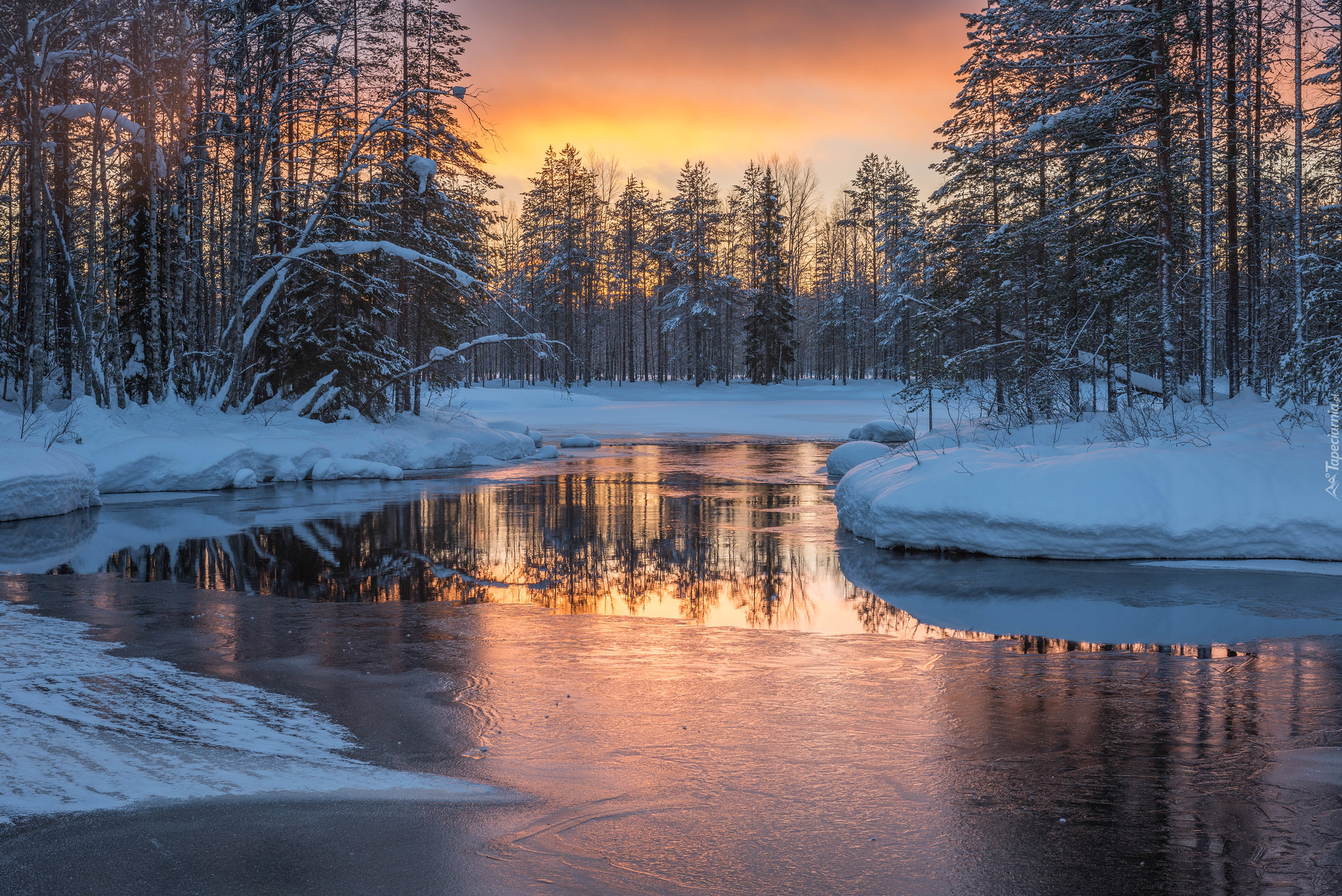 Edytor tapety: Ośnieżony brzeg rzeki w blasku zachodzącego słońca