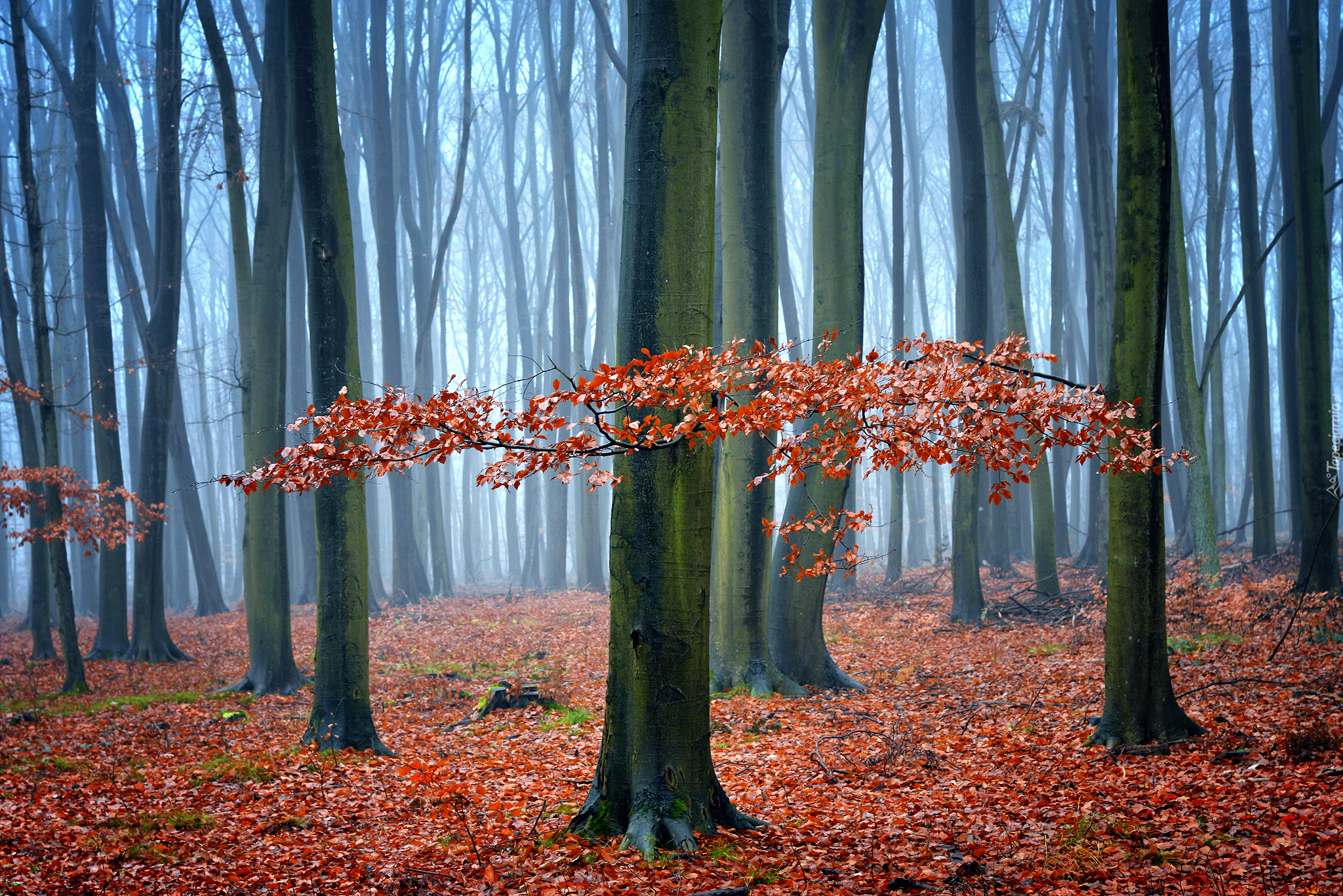 Edytor tapety: Opadłe brązowe liście pod drzewami w lesie