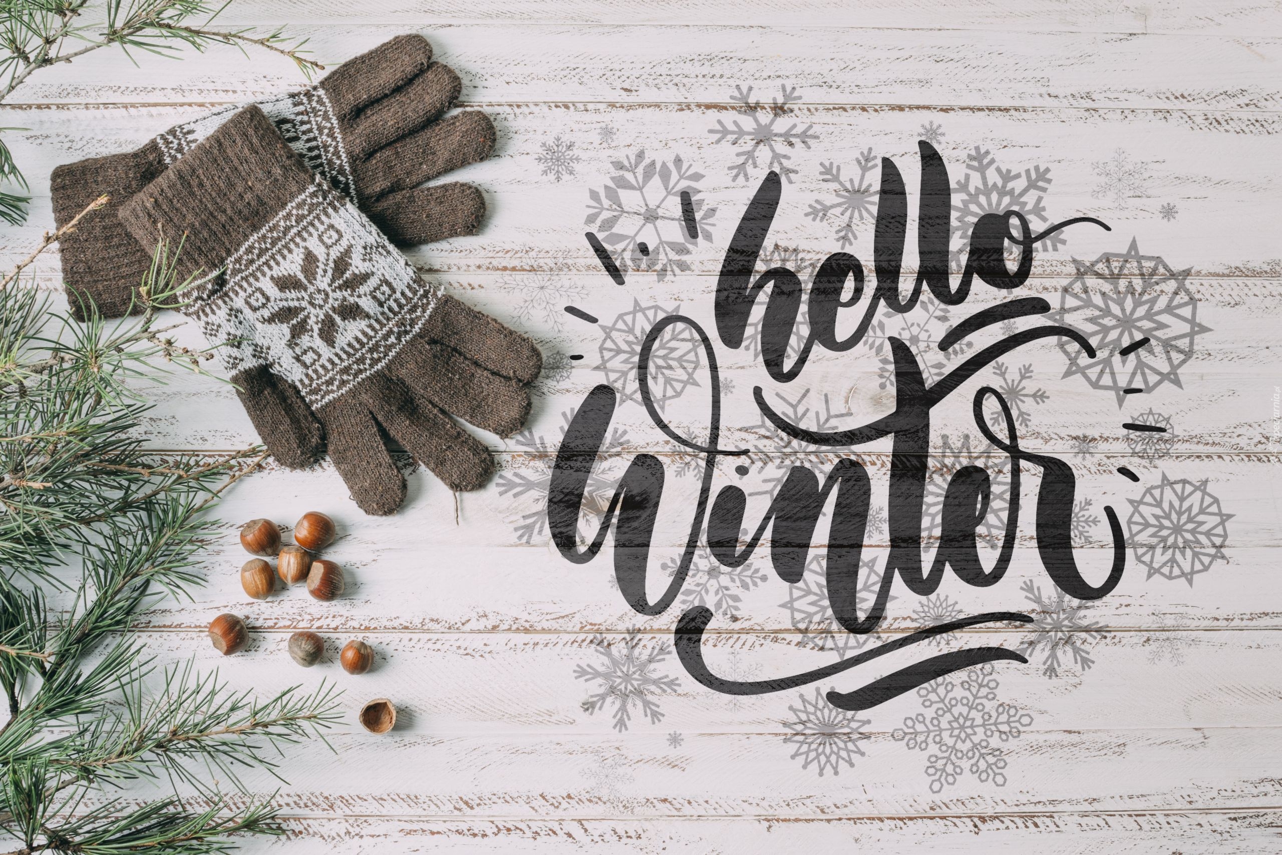 Edytor tapety: Rękawiczki obok napisu witaj zimo