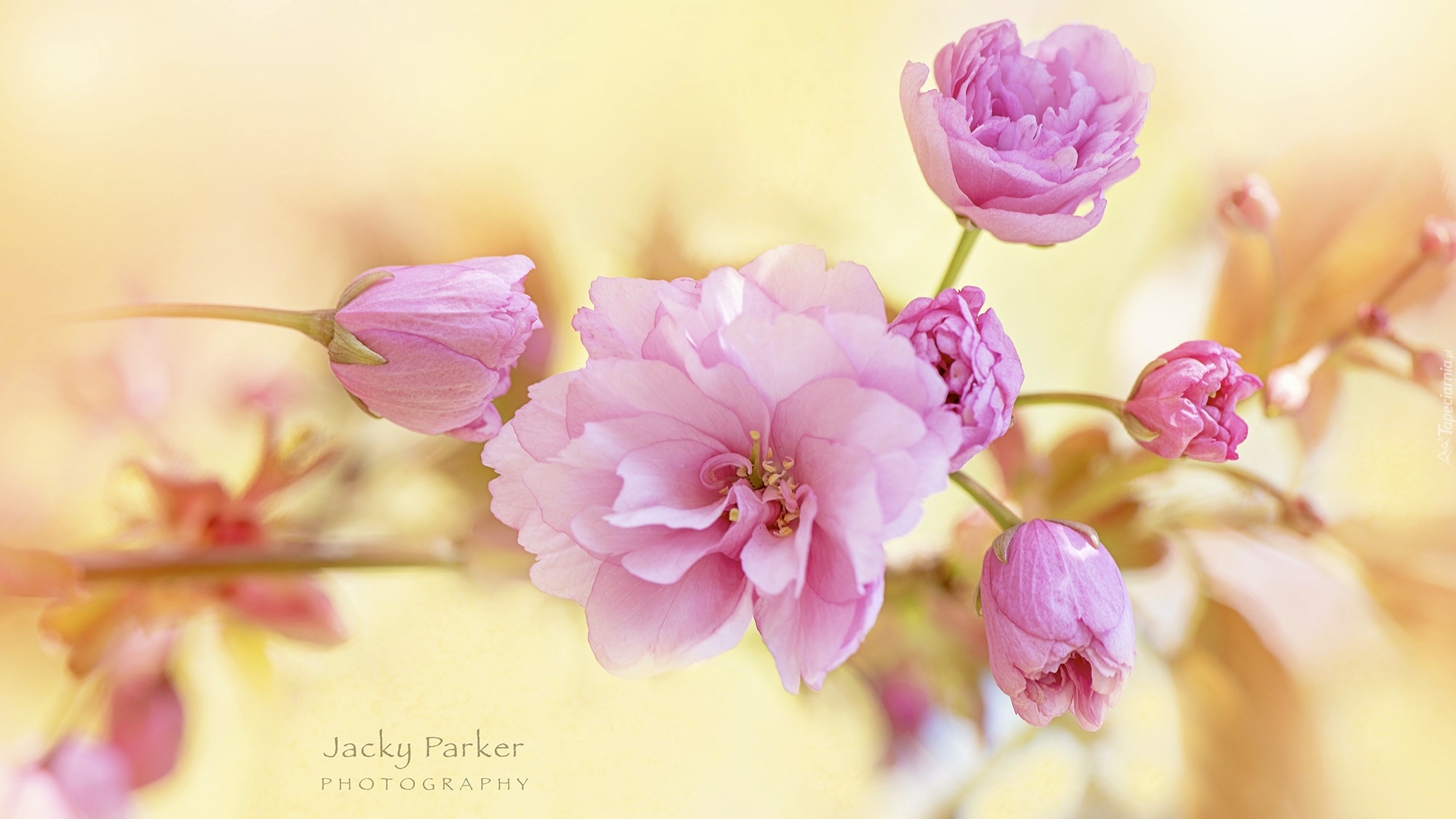 Edytor tapety: Kwitnące kwiaty wiśni japońskiej na gałązce