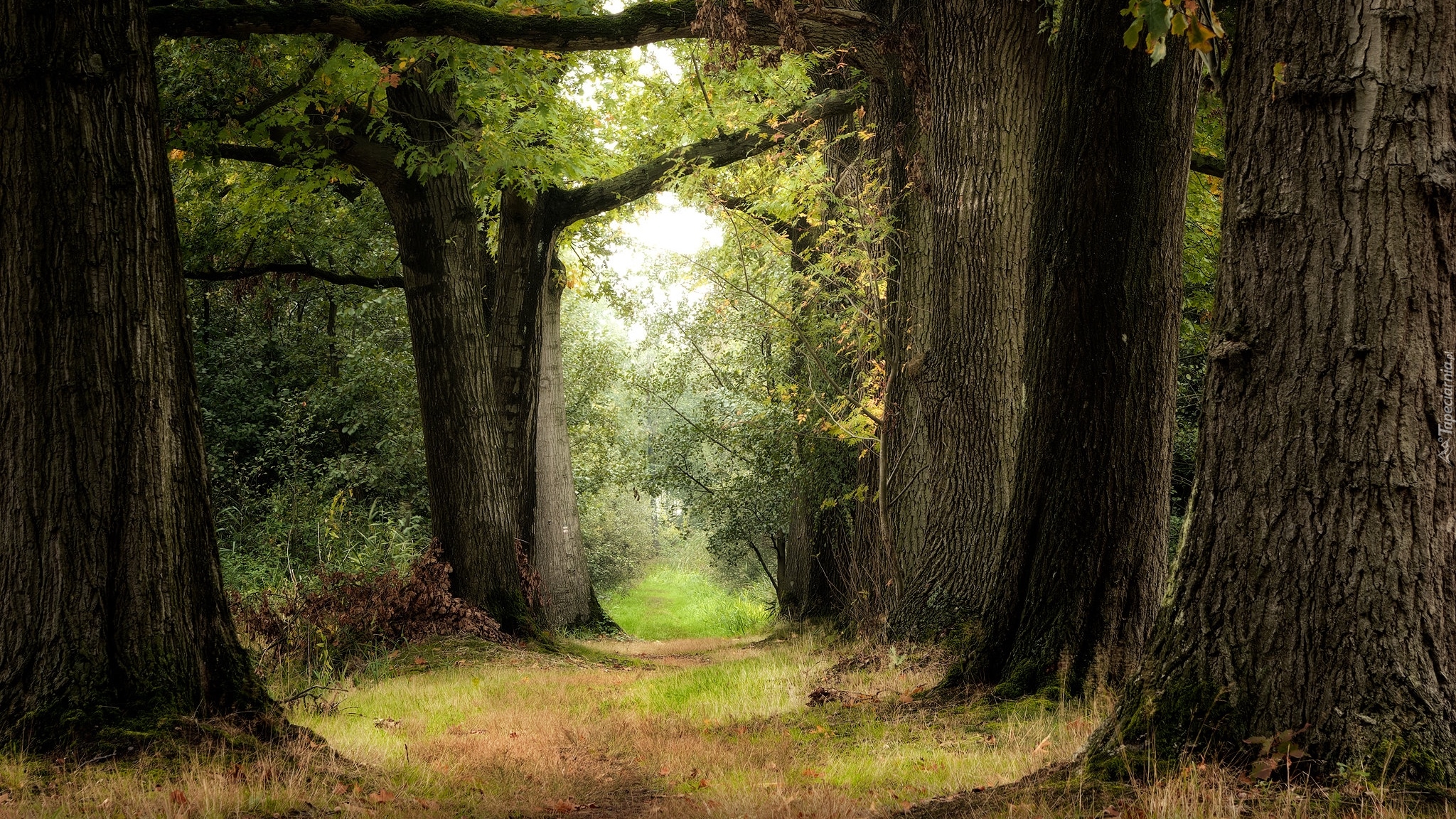 Edytor tapety: Ścieżka porośnięta trawą prowadząca przez las